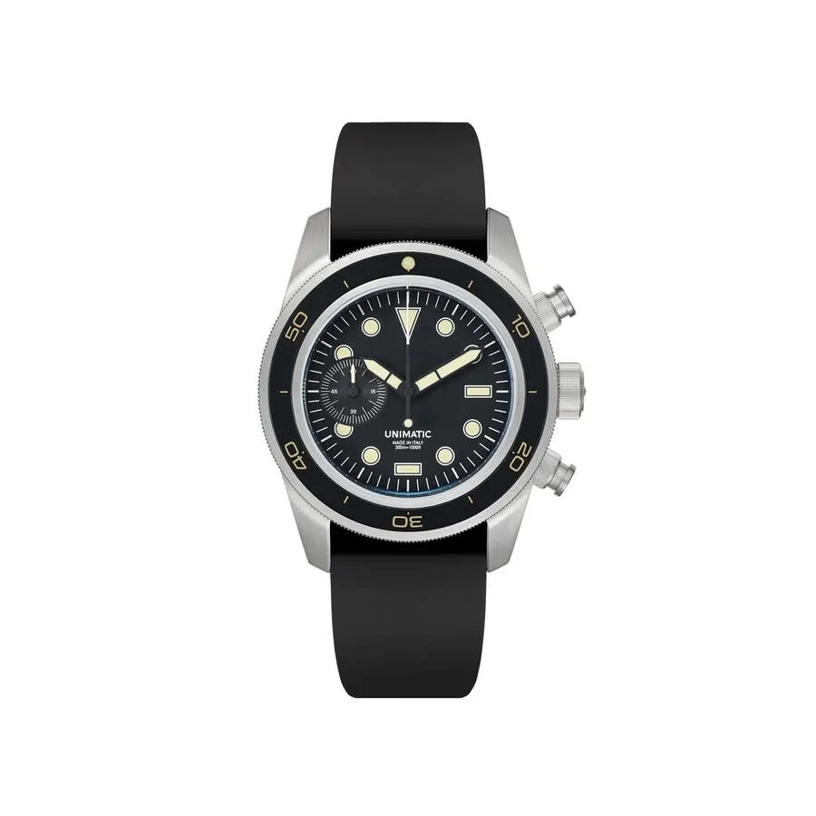 Silver-tone stainless steel case with a black leather strap. Black stainless steel bezel. Black dial with black hands and index hour markers. Minute markers around the outer rim. Dial Type: Analog. Luminescent hands and markers. Automatic movement. Screw down crown. Round case shape, case size: 41.5 mm. Water resistant at 300 meters / 1000 feet. Functions: hour, minute, second. Modello Tre Series. Dive watch style. Unimatic Modello Tre Automatic Black Dial Men's Watch U3-DHB. GENERAL Box Type: Original Box CASE Case Material: Stainless Steel Case Shape: Round BAND Band Material: Leather Band Type: Strap Band Color: Black DIAL Dial Color: Black Type: Analog Hands: Black Dial Markers: Index Second Markers: Minute Markers around the outer rim Luminiscence: Hands and Markers Bezel Color: Black Bezel Material: Stainless Steel Crown: Screw Down INFORMATION Brand: Unimatic Series: Modello Tre Collection Name: Modello Tre Gender: Mens Model: U3-DHB Movement: Automatic FEATURES Water Resistance: 300 meters / 1000 feet Functions: Hour, Minute, Second Watch Features: Stainless Steel, Leather, Analog ADDITIONAL INFO Watch Style: Dive Jomashop Sku: Y-A5W2E Department: Watches
