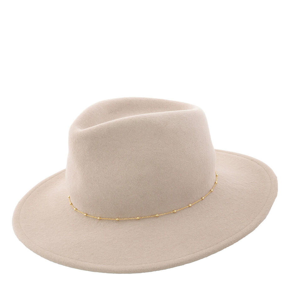 Van Palma Ladies Hats. Fashion category: Hats. SKU: NOE-LIGHT BEIGE. Van Palma Noe Light Beige Hat. Crafted from soft lamb felt, the Noe fedora features a pinched geometric crown, wide flat brim, and an 18k gold-filled brass chain accent. A modern statement with refined detailing. Lamb felt construction. 18k gold-filled brass chain. Pinched crown, flat wide brim. Hand wash only. GENERAL Ring Style: Fashion Gender: Womens Color: Light Beige Apparel Type: Hats INFORMATION Brand: Van Palma Model: NOE-LIGHT BEIGE ADDITIONAL INFO Jomashop Sku: -NOELIGHTBEIGE Department: Fashion Accessories Category: Hats
