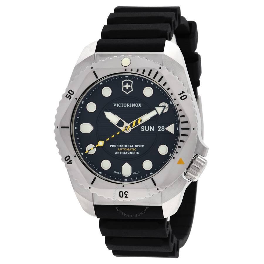 Silver-tone stainless steel case with a black rubber strap. Uni-directional rotating silver-tone stainless steel bezel. Black dial with silver-tone hands and index hour markers. Minute markers around the outer rim. Dial Type: Analog. Luminescent hands and markers. Day of the week and date display at the 3 o'clock position. Automatic movement. Screw down crown. Solid case back. Round case shape, case size: 43 mm. Buckle clasp. Water resistant at 300 meters / 1000 feet. Functions: date, day, hour, minute, second. Dive Pro Series. Dive watch style. Watch label: Swiss Made. Victorinox Dive Pro Automatic Black Dial Men's Watch 241994. GENERAL Box Type: Original Box CASE Case Diameter: 43 mm Case Material: Stainless Steel Case Shape: Round Case Back: Solid BAND Band Material: Rubber Band Type: Strap Band Color: Black Clasp: Buckle DIAL Dial Color: Black Type: Analog Hands: Silver-tone Dial Markers: Index Second Markers: Minute Markers around the outer rim Luminiscence: Hands and Markers Bezel: Uni-directional Rotating Bezel Color: Silver-tone Bezel Material: Stainless Steel Crown: Screw Down INFORMATION Brand: Victorinox Series: Dive Pro Collection Name: Dive Pro Gender: Mens Model: 241994 Watch Label: Swiss Made Movement: Automatic FEATURES Water Resistance: 300 meters / 1000 feet Calendar: Day of the Week and Date display at the 3 o'clock position Functions: Date, Day, Hour, Minute, Second Watch Features: Analog, Rubber, Stainless Steel ADDITIONAL INFO Watch Style: Dive Warranty: 3 Year Jomashop Warranty Jomashop Sku: VICT241994 Department: Watches