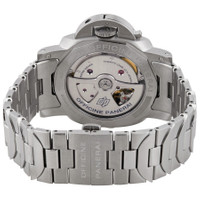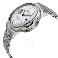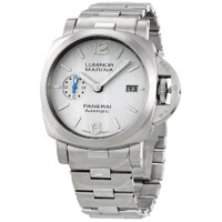 Stainless steel case with a stainless steel bracelet. Fixed stainless steel bezel. Silver dial with luminous silver-tone hands and index hour markers. Arabic numerals mark the 6 and 12 o'clock positions. Dial Type: Analog. Luminescent hands. Date display at the 3 o'clock position. Small seconds sub-dial at the 9 o'clock position. Panerai calibre P.9010 automatic movement, containing 31 Jewels, composed of 200 parts, bitting at 28800 vph, and has a power reserve of approximately 72 hours. Scratch resistant sapphire crystal. Transparent case back. Cushion case shape. Case size: 42 mm. Band width: 22 mm. Fold over clasp with a push button release. Water resistant at 100 meters / 330 feet. Functions: date, hour, minute, small second. Luxury watch style. Watch label: Swiss Made. Panerai Luminor 1950 Automatic Silver Dial Men's 42 mm Watch PAM00977. GENERAL Box Type: Original Box CASE Case Diameter: 42 mm Case Material: Stainless Steel Case Shape: Cushion Case Back: Transparent BAND Band Material: Stainless Steel Band Type: Bracelet Band Color: Silver-tone Band Width: 22 mm Clasp: Fold Over with Push Button Release DIAL Dial Color: Silver Type: Analog Crystal: Scratch Resistant Sapphire Hands: Luminous Silver-tone Dial Markers: Index Second Markers: Arabic Numerals mark the 6 and 12 o'clock positions Sub Dials: Small Second Luminiscence: Hands Bezel: Fixed Bezel Color: Silver-tone Bezel Material: Stainless Steel INFORMATION Brand: Panerai Series: Luminor Collection Name: Luminor 1950 Gender: Mens Model: PAM00977 Watch Label: Swiss Made Movement: Automatic Engine: Panerai Calibre P.9010 Power Reserve: 72 hours FEATURES Water Resistance: 100 meters / 330 feet Calendar: Date display at the 3 o'clock position Functions: Date, Hour, Minute, Small Second Watch Features: Stainless Steel, Analog ADDITIONAL INFO Watch Style: Luxury Warranty: 2 Year Jomashop Warranty UPC Code: 7613375195849 Jomashop Sku: PAM00977 Department: Watches Category: Watches