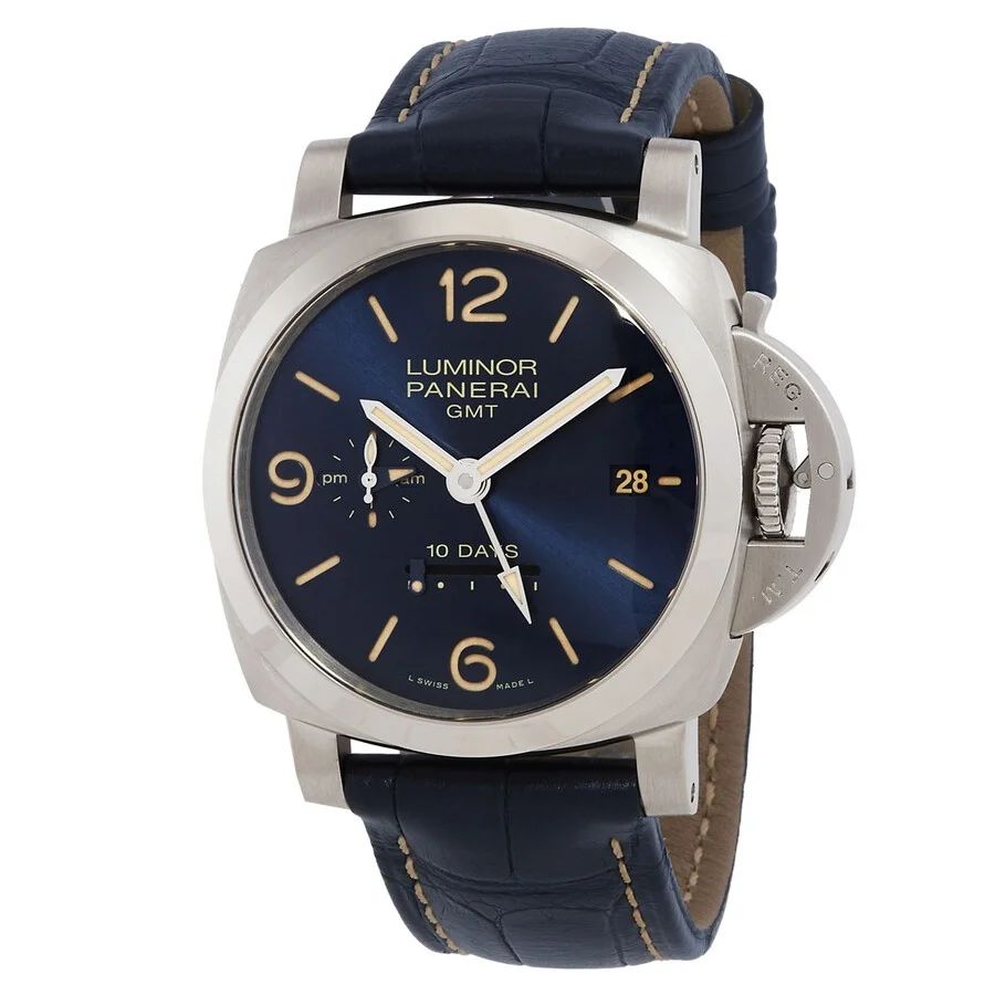 Stainless steel case with a blue leather strap. Fixed stainless steel bezel. Blue dial with luminous silver-tone hands and index hour markers. Arabic numerals appear at the 6, 9 and 12 o'clock positions. Dial Type: Analog. Date display at the 3 o'clock position. Linear power reserve indicator. Panerai calibre P.2003 automatic movement, containing 25 Jewels, composed of 281 parts, bitting at 28800 vph, and has a power reserve of approximately 240 hours. Scratch resistant sapphire crystal. Screw down crown. Transparent case back. Cushion case shape. Case size: 44 mm. Tang clasp. Water resistant at 100 meters / 330 feet. Functions: hours, minutes, small seconds, date, GMT, 24h indicator, power reserve indicator, seconds reset. Additional Info: original box, international warranty card, manual (complete accessories). Luminor 1950 Series. Luxury watch style. Watch label: Swiss Made. Panerai Luminor 1950 GMT 10 Day Power Reserve Automatic Blue Dial Men's Watch PAM00986. CASE Case Size: 44 Case Material: Stainless Steel Case Shape: Cushion Case Back: Transparent BAND Band Material: Leather Band Type: Strap Band Color: Blue Clasp: Tang DIAL Dial Color: Blue Type: Analog Crystal: Scratch Resistant Sapphire Hands: Silver-tone Dial Markers: Index Second Markers: Arabic Numerals appear at the 6, 9 and 12 o'clock positions Sub Dials: Linear Power Reserve Indicator Bezel: Fixed Bezel Color: Silver-tone Bezel Material: Stainless Steel Crown: Screw Down INFORMATION Brand: Panerai Series: Luminor 1950 Collection Name: Luminor 1950 Gender: Mens Model: PAM00986 Watch Label: Swiss Made Movement: Automatic Engine: Panerai Calibre P.2003 Power Reserve: 240 hours FEATURES Water Resistance: 100 meters / 330 feet Calendar: Date display at the 3 o'clock position Functions: Hours, Minutes, Small Seconds, Date, GMT, 24h indicator, Power Reserve Indicator, Seconds Reset Watch Features: Stainless Steel, Leather, Analog, GMT, Power Reserve Indicator ADDITIONAL INFO Watch Style: Luxury Warranty: 2 Year Jomashop Warranty Additional Info: Original Box, Manual (Complete Accessories) Jomashop Sku: PAM00986 Department: Watches Category: Watches