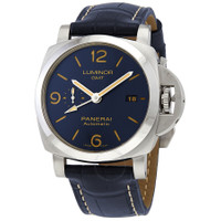 Stainless steel case with a blue (alligator) leather strap. Fixed stainless steel bezel. Blue dial with luminous silver-tone hands and index hour markers. Arabic numerals mark the 6, 9 and 12 o'clock positions. Dial Type: Analog. Luminescent hands and markers. Date display at the 3 o'clock position. Small seconds sub-dial at the 9 o'clock position. Panerai calibre P.9011 automatic movement, containing 31 Jewels, composed of 239 parts, bitting at 28800 vph, and has a power reserve of approximately 72 hours. Scratch resistant sapphire crystal. Protected crown. Transparent case back. Cushion case shape. Case size: 44 mm. Band width: 24 mm. Tang clasp. Water resistant at 300 meters / 1000 feet. Functions: GMT, second time zone, hour, minute, second, date, power reserve indicator. Luminor 1950 Series. Dive watch style. Watch label: Swiss Made. Panerai Luminor 1950 GMT Automatic Blue Dial Men's Watch PAM01033. GENERAL Box Type: Original Box CASE Case Size: 44 Case Material: Stainless Steel Case Shape: Cushion Case Back: Transparent BAND Band Material: (Alligator) Leather Band Type: Strap Band Color: Blue Band Width: 24 mm Clasp: Tang DIAL Dial Color: Blue Type: Analog Crystal: Scratch Resistant Sapphire Hands: Luminous Silver-tone Dial Markers: Index Second Markers: Arabic Numerals mark the 6, 9 and 12 o'clock positions Sub Dials: Small Seconds Luminiscence: Hands and Markers Bezel: Fixed Bezel Color: Silver-tone Bezel Material: Stainless Steel Crown: Protected INFORMATION Brand: Panerai Series: Luminor Collection Name: Luminor 1950 Gender: Mens Model: PAM01033 Watch Label: Swiss Made Movement: Automatic Engine: Panerai Calibre P.9011 Power Reserve: 3 days FEATURES Water Resistance: 300 meters / 1000 feet Calendar: Date display at the 3 o'clock position Functions: GMT, Second Time Zone, Hour, Minute, Second, Date, Power Reserve Indicator Watch Features: Alligator Leather, Analog, GMT, Power Reserve Indicator, Leather, Stainless Steel, Time Zone ADDITIONAL INFO Watch Style: Dive Warranty: 2 Year Jomashop Warranty Jomashop Sku: PAMPAM01033 Department: Watches Category: Watches