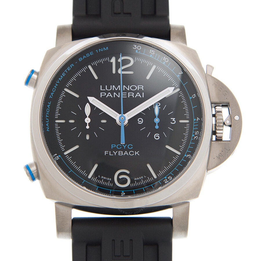 Silver-tone titanium case with a black rubber strap. Fixed silver-tone titanium bezel. Black dial with index hour markers. Dial Type: Analog. Panerai Calibre P.9100 automatic movement with a 72-hour power reserve. Scratch resistant sapphire crystal. Solid case back. Cushion case shape, case size: 44 mm, case thickness: 24. Tang clasp. Functions: hour, minute, second. Additional Info: original box, international warranty card, manual (complete accessories). Sport watch style. Watch label: Swiss Made. Panerai LUMINOR Black Dial Unisex Watch PAM00764. Luminor PCYC Chrono Flyback Automatic Titanio Black GENERAL Box Type: Original Box CASE Case Size: 44 Case Thickness: 24 mm Case Material: Titanium Case Shape: Cushion Case Back: Solid BAND Band Material: Rubber Band Type: Strap Band Color: Black Clasp: Tang DIAL Dial Color: Black Type: Analog Crystal: Scratch Resistant Sapphire Dial Markers: Index Bezel: Fixed Bezel Color: Silver-tone Bezel Material: Titanium Crown: Pull / Push INFORMATION Brand: Panerai Series: Luminor Collection Name: Luminor 1950 Gender: Mens Model: DUPL. Watch Label: Swiss Made Movement: Automatic Engine: Panerai Calibre P.9100 Power Reserve: 72 hours FEATURES Functions: Hour, Minute, Second Watch Features: Titanium, Rubber, Analog, Flyback ADDITIONAL INFO Watch Style: Sport Warranty: 2 Year Jomashop Warranty Additional Info: Original Box, Manual (Complete Accessories) Jomashop Sku: PAMPAM00764 Department: Watches Category: Watches