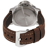 Stainless steel case with a brown leather strap. Fixed stainless steel bezel. Black dial with luminous black hands and index hour markers. Arabic numerals mark the 3, 6, 9 and 12 o'clock positions. Dial Type: Analog. Small seconds sub-dial. Panerai calibre P.5000 hand wind movement, containing 21 Jewels, composed of 127 parts, bitting at 21600 vph, and has a power reserve of approximately 192 hours. Scratch resistant sapphire crystal. Pull / push crown. Solid case back. Cushion case shape. Case size: 44 mm. Band width: 24 mm / 22 mm. Tang clasp. Water resistant at 30 meters / 100 feet. Functions: hour, minute, small second. Luminor Series. Luxury watch style. Watch label: Swiss Made. Panerai Luminor Hand Wind Black Dial Men's 44 mm Watch PAM00914. GENERAL Box Type: Original Box CASE Case Size: 44 Case Material: Stainless Steel Case Shape: Cushion Case Back: Solid BAND Band Material: Leather Band Type: Strap Band Color: Brown Band Width: 24 mm / 22 mm Clasp: Tang DIAL Dial Color: Black Type: Analog Crystal: Scratch Resistant Sapphire Hands: Luminous Black Dial Markers: Index Second Markers: Arabic Numerals mark the 3, 6, 9 and 12 o'clock positions Sub Dials: One - Small Second Bezel: Fixed Bezel Color: Silver-tone Bezel Material: Stainless Steel Crown: Pull / Push INFORMATION Brand: Panerai Series: Luminor Collection Name: Luminor Gender: Mens Model: PAM00914 Watch Label: Swiss Made Movement: Hand Wind Engine: Panerai Calibre P.5000 Power Reserve: 192 hours FEATURES Water Resistance: 30 meters / 100 feet Functions: Hour, Minute, Small Second Watch Features: Stainless Steel, Analog, Leather ADDITIONAL INFO Watch Style: Luxury Warranty: 2 Year Jomashop Warranty UPC Code: 7613375223726 Jomashop Sku: PAM00914 Department: Watches Category: Watches