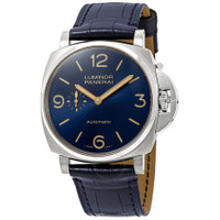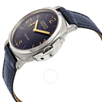 Grey titanium case with a blue alligator leather strap. Fixed grey titanium bezel. Blue dial with luminous gold-tone hands and index hour markers. Arabic numerals mark the 6, 9 and 12 o'clock positions. Dial Type: Analog. Luminescent hands. Small second subdial. Panerai Calibre P.4000 Automatic movement, containing 31 Jewels, composed of 203 parts, bitting at 28800 vph, and has a power reserve of approximately 72 hours. Scratch resistant sapphire crystal. Transparent case back. Cushion case shape. Case size: 45 mm. Band width: 24 mm. Tang clasp. Water resistant at 30 meters / 100 feet. Functions: hour, minute, small second. Luxury watch style. Watch label: Swiss Made. Panerai Luminor Automatic Blue Dial Men's Watch PAM00729. CASE Case Size: 45 Case Material: Titanium Case Shape: Cushion Case Back: Transparent BAND Band Material: Alligator Leather Band Type: Strap Band Color: Blue Band Width: 24 mm Clasp: Tang DIAL Dial Color: Blue Type: Analog Crystal: Scratch Resistant Sapphire Hands: Luminous Gold-tone Dial Markers: Index Second Markers: Arabic Numerals mark the 6, 9 and 12 o'clock positions Sub Dials: One - Small Second Luminiscence: Hands Bezel: Fixed Bezel Color: Grey Bezel Material: Titanium INFORMATION Brand: Panerai Series: Luminor Collection Name: Luminor Gender: Mens Model: PAM00729 Watch Label: Swiss Made Movement: Automatic Engine: Panerai Calibre P.4000 Power Reserve: 72 hours FEATURES Water Resistance: 30 meters / 100 feet Functions: Hour, Minute, Small Second Watch Features: Alligator Leather, Titanium, Leather, Gold, Analog ADDITIONAL INFO Watch Style: Luxury Warranty: 2 Year Jomashop Warranty UPC Code: 7613268803394 Jomashop Sku: PAM00729 Department: Watches Category: Watches