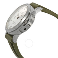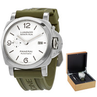 Stainless steel case with a green rubber strap. Fixed silver-tone stainless steel bezel. White dial with silver-tone hands. Dial Type: Analog. Date display at the o'clock position. One subdial displaying: small second. Panerai Calibre P.9010 Automatic movement, containing 31 Jewels, composed of 200 parts, bitting at 28800 vph, and has a power reserve of approximately 72 hours. Scratch resistant sapphire crystal. Screw down crown. Solid case back. Cushion case shape, case size: 44 mm. Tang clasp. Water resistant at 300 meters / 1000 feett. Functions: date, hour, minute, small second. Luminor Series. Luxury watch style. Watch label: Swiss Made. Panerai Luminor Automatic White Dial Men's Watch PAM01314. GENERAL Box Type: Original Box CASE Case Size: 44 Case Material: Stainless Steel Case Shape: Cushion Case Back: Solid BAND Band Material: Rubber Band Type: Strap Band Color: Green Clasp: Tang DIAL Dial Color: White Type: Analog Crystal: Scratch Resistant Sapphire Hands: Silver-tone Sub Dials: One - Small Second Bezel: Fixed Bezel Color: Silver-tone Bezel Material: Stainless Steel Crown: Screw Down INFORMATION Brand: Panerai Series: Luminor Collection Name: Luminor Gender: Mens Model: PAM01314 Watch Label: Swiss Made Movement: Automatic Engine: Panerai Calibre P.9010 Power Reserve: 72 hours FEATURES Water Resistance: 300 meters / 1000 feett Calendar: Date display at the o'clock position Functions: Date, Hour, Minute, Small Second Watch Features: Stainless Steel, Rubber, Analog ADDITIONAL INFO Watch Style: Luxury Warranty: 2 Year Jomashop Warranty Jomashop Sku: PAM01314R Department: Watches Category: Watches