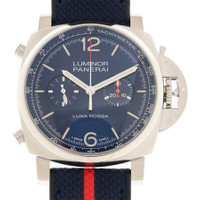 Stainless steel case with a blue rubber strap. Fixed stainless steel bezel. Blue dial with luminous silver-tone hands and index hour markers. Arabic numerals appear at the 6 and 12 o'clock positions. Minute markers. Tachymeter markings around the outer rim. Dial Type: Analog. Luminescent hands and markers. Chronograph - two sub-dials displaying: 60 second and 30 minute. Panerai calibre P.9200 automatic movement with a 42-hour power reserve. Scratch resistant sapphire crystal. Screw down crown. Solid case back. Cushion case shape. Case size: 44 mm. Tang clasp. Water resistant at 100 meters / 330 feet. Functions: chronograph, tachymeter, hour, minute, second. Additional Info: original box, manual (complete accessories). Luminor Chrono Luna Rossa Series. Luxury watch style. Watch label: Swiss Made. Panerai Luminor Chrono Luna Rossa Chronograph Automatic Blue Dial Men's Watch PAM01303. GENERAL Box Type: Original Box CASE Case Size: 44 Case Material: Stainless Steel Case Shape: Cushion Case Back: Solid BAND Band Material: Rubber Band Type: Strap Band Color: Blue Clasp: Tang DIAL Dial Color: Blue Type: Analog Crystal: Scratch Resistant Sapphire Hands: Luminous Silver-tone Dial Markers: Index Second Markers: Arabic Numerals appear at the 6 and 12 o'clock positions. Minute Markers. Tachymeter Markings around the outer rim Sub Dials: Two - 60 Second and 30 Minute Luminiscence: Hands and Markers Bezel: Fixed Bezel Color: Silver-tone Bezel Material: Stainless Steel Crown: Screw Down INFORMATION Brand: Panerai Series: Luminor Collection Name: Luminor Chrono Luna Rossa Gender: Mens Model: PAM01303 Watch Label: Swiss Made Movement: Automatic Engine: Panerai Calibre P.9200 Power Reserve: 42 hours FEATURES Water Resistance: 100 meters / 330 feet Functions: Chronograph, Tachymeter, Hour, Minute, Second Watch Features: Analog, Rubber, Stainless Steel, Chronograph ADDITIONAL INFO Watch Style: Luxury Warranty: 2 Year Jomashop Warranty Additional Info: Original Box, Manual (Complete Accessories) Jomashop Sku: PAM01303 Department: Watches Category: Watches