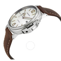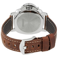 Stainless steel case with a brown (calfskin) leather strap. Fixed stainless steel bezel. Silver dial with luminous silver-tone hands and index hour markers. Arabic numerals mark the 6 and 12 o'clock positions. Dial Type: Analog. Date display at the 4 o'clock position. Small seconds sub-dial at the 9 o'clock position. Panerai calibre P.900 automatic movement, based upon Panerai OP XXXIV, containing 25 Jewels, bitting at 28800 vph, and has a power reserve of approximately 72 hours. Scratch resistant sapphire crystal. Screw down crown. Solid case back. Cushion case shape. Case size: 42 mm. Band width: 22 mm / 18 mm. Tang clasp. Water resistant at 30 meters / 100 feet. Functions: date, hour, minute, small second. Luxury watch style. Watch label: Swiss Made. Panerai Luminor Due Automatic Silver Dial Men's Watch PAM01046. GENERAL Box Type: Original Box CASE Case Size: 42 Case Material: Stainless Steel Case Shape: Cushion Case Back: Solid BAND Band Material: (Calfskin) Leather Band Type: Strap Band Color: Brown Band Width: 22 mm / 18 mm Clasp: Tang DIAL Dial Color: Silver Type: Analog Crystal: Scratch Resistant Sapphire Hands: Luminous Silver-tone Dial Markers: Index Second Markers: Arabic Numerals mark the 6 and 12 o'clock positions Sub Dials: Small Seconds Luminiscence: Hands Bezel: Fixed Bezel Color: Silver-tone Bezel Material: Stainless Steel Crown: Screw Down INFORMATION Brand: Panerai Series: Luminor Due Collection Name: Luminor Due Gender: Mens Model: PAM01046 Watch Label: Swiss Made Movement: Automatic Engine: Panerai Calibre P.900 Power Reserve: 72 hours FEATURES Water Resistance: 30 meters / 100 feet Calendar: Date display at the 4 o'clock position Functions: Date, Hour, Minute, Small Second Watch Features: Analog, Leather, Stainless Steel ADDITIONAL INFO Watch Style: Luxury Warranty: 2 Year Jomashop Warranty UPC Code: 7613375260400 Jomashop Sku: PAM01046 Department: Watches Category: Watches