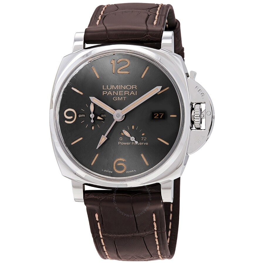 Polished stainless steel case with a beige leather strap. Fixed stainless steel bezel. Anthracite dial with luminous silver-tone hands and index hour markers. Arabic numerals mark the 6, 9 and 12 o'clock positions. Dial Type: Analog. Luminescent hands. Date display at the 3 o'clock position. Two sub-dials displaying: power reserve and 24 hour. Panerai calibre P.4002 automatic movement, containing 31 Jewels, composed of 288 parts, bitting at 28800 vph, and has a power reserve of approximately 72 hours. Scratch resistant sapphire crystal. Pull / push crown. Transparent case back. Cushion case shape. Case size: 45 mm. Band width: 24 mm / 22 mm. Tang clasp. Water resistant at 30 meters / 100 feet. Functions: GMT, second time zone, hour, minute, second, date. Luminor Due Gmt Series. Luxury watch style. Watch label: Swiss Made. Panerai Luminor Due GMT Automatic Anthracite Dial Men's Watch PAM00944. GENERAL Box Type: Original Box CASE Case Size: 45 Case Material: Polished Stainless Steel Case Shape: Cushion Case Back: Transparent BAND Band Material: Leather Band Type: Strap Band Color: Beige Band Width: 24 mm / 22 mm Clasp: Tang DIAL Dial Color: Anthracite Type: Analog Crystal: Scratch Resistant Sapphire Hands: Luminous Silver-tone Dial Markers: Index Second Markers: Arabic Numerals mark the 6, 9 and 12 o'clock positions Sub Dials: Two - Power Reserve and 24 Hour Luminiscence: Hands Bezel: Fixed Bezel Color: Silver-tone Bezel Material: Stainless Steel Crown: Pull / Push INFORMATION Brand: Panerai Series: Luminor Due Collection Name: Luminor Due GMT Gender: Mens Model: PAM00944 Watch Label: Swiss Made Movement: Automatic Engine: Panerai Calibre P.4002 Power Reserve: 3 days FEATURES Water Resistance: 30 meters / 100 feet Calendar: Date display at the 3 o'clock position Functions: GMT, Second Time Zone, Hour, Minute, Second, Date Watch Features: Analog, GMT, Leather, Stainless Steel, Time Zone ADDITIONAL INFO Watch Style: Luxury Warranty: 2 Year Jomashop Warranty UPC Code: 7613268934272 Jomashop Sku: PAM00944 Department: Watches Category: Watches
