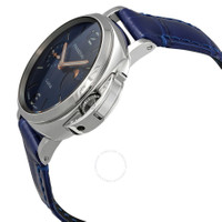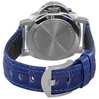 Silver-tone stainless steel case with a blue alligator band. Fixed silver-tone stainless steel bezel. Blue dial with rose gold-tone hands and index hour markers. Dial Type: Analog. Luminescent hands and markers. One subdial displaying: small second. Panerai Calibre P.900 Automatic movement, based upon Panerai OP XXXIV, containing 25 Jewels, bitting at 28800 vph, and has a power reserve of approximately 72 hours. Scratch resistant sapphire crystal. Solid case back. Round case shape, case size: 38 mm. Buckle clasp. Water resistant at 30 meters / 100 feet. Functions: date, hour, minute, small second. Additional Info: original box, international warranty card, manual (complete accessories). Luminor Due Luna Series. Luxury watch style. Watch label: Swiss Made. Panerai Luminor Due Luna Automatic Blue Dial Men's Watch PAM01179. INFORMATION Brand: Panerai Series: Luminor Due Luna Collection Name: Luminor Due Luna Gender: Mens Model: PAM01179 Watch Label: Swiss Made Movement: Automatic Engine: Panerai Calibre P.900 Power Reserve: 72 hours CASE Case Size: 38 mm Case Material: Stainless Steel Case Shape: Round Case Back: Solid BAND Band Material: Alligator Band Type: Strap Band Color: Blue Clasp: Buckle DIAL Dial Color: Blue Type: Analog Crystal: Scratch Resistant Sapphire Hands: Rose Gold-tone Dial Markers: Index Sub Dials: One - Small Second Luminiscence: Hands and Markers Bezel: Fixed Bezel Color: Silver-tone Bezel Material: Stainless Steel FEATURES Water Resistance: 30 meters / 100 feet Functions: Date, Hour, Minute, Small Second Watch Features: Stainless Steel, Gold, Analog, Alligator Leather ADDITIONAL INFO Watch Style: Luxury Warranty: 2 Year Jomashop Warranty Additional Info: Original Box, International Warranty Card, Manual (Complete Accessories) Jomashop Sku: PAM01179 Department: Watches Category: Watches