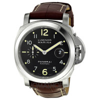 Silver-tone stainless steel case with a brown leather strap. Fixed silver-tone polished stainless steel bezel. Black dial with luminous hands and Arabic numeral hour markers. Minute markers around the outer rim. Dial Type: Analog. Luminescent hands and markers. Date display at the 3 o'clock position. Seconds sub-dial at the 9 o'clock position subdials. Panerai Calibre OP III Automatic movement, based upon 7750-P1, containing 21 Jewels, bitting at 28800 vph, and has a power reserve of approximately 42 hours. Scratch resistant domed anti-reflective sapphire crystal. Stainless steel with patented locking mecha crown. Solid case back. Cushion case shape. Case size: 44 mm. Deployment clasp. Water resistant at 300 meters / 1000 feet. Functions: date, hour, minute, small second, chronometer. Additional Info: includes additional rubber strap. Dive watch style. Watch label: Swiss Made. Panerai Luminor Marina Automatic Men's Watch PAM00164. GENERAL Box Type: Original Box Color: Black / Brown CASE Case Size: 44 Case Material: Stainless Steel Case Shape: Cushion Case Back: Solid BAND Band Material: Leather Band Type: Strap Band Color: Brown Clasp: Deployment DIAL Dial Color: Black Type: Analog Crystal: Domed Anti-reflective Sapphire Hands: Luminous Dial Markers: Arabic Numeral Second Markers: Minute Markers around the outer rim Sub Dials: One - Small Second at the 9 o'clock position Luminiscence: Hands and Markers Bezel: Fixed Bezel Color: Silver-tone Bezel Material: Polished Stainless Steel Crown: Stainless Steel with Patented Locking Mecha INFORMATION Brand: Panerai Series: Luminor Collection Name: Luminor Marina Automatic Gender: Mens Model: PAM00164 Watch Label: Swiss Made Movement: Automatic Engine: Panerai Calibre OP III Power Reserve: 42 hours FEATURES Water Resistance: 300 meters / 1000 feet Calendar: Date display at the 3 o'clock position Functions: Date, Hour, Minute, Small Second, Chronometer Watch Features: Stainless Steel, Rubber, Leather, Analog, Chronometer ADDITIONAL INFO Watch Style: Dive Warranty: 2 Year Jomashop Warranty UPC Code: 7612456252709 Additional Info: Includes additional rubber strap Jomashop Sku: PAM00164 Department: Watches Category: Watches
