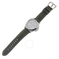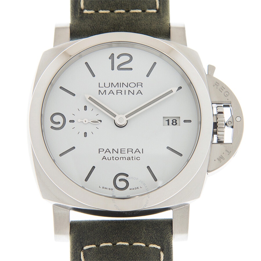 Stainless steel case with a scamosciato Green leather strap. Fixed stainless steel bezel. White dial with luminous silver-tone hands and index hour markers. Arabic numerals appear at the 6, 9 and 12 o'clock positions. Dial Type: Analog. Luminescent hands and markers. Date display at the 3 o'clock position. Small seconds sub-dial at the 9 o'clock position. Panerai calibre P.9010 automatic movement, containing 31 Jewels, composed of 200 parts, bitting at 28800 vph, and has a power reserve of approximately 72 hours. Scratch resistant sapphire crystal. Screw down crown. Solid case back. Cushion case shape, case size: 44 mm. Tang clasp. Water resistant at 300 meters / 1000 feet. Functions: date, hour, minute, small second. Additional Info: original box, manual (complete accessories). Luminor Series. Luxury watch style. Watch label: Swiss Made. Panerai Luminor Marina Automatic White Dial Men's Watch PAM01314. INFORMATION Brand: Panerai Series: Luminor Collection Name: Luminor Gender: Mens Model: PAM01314 Watch Label: Swiss Made Movement: Automatic Engine: Panerai Calibre P.9010 Power Reserve: 72 hours CASE Case Size: 44 mm Case Material: Stainless Steel Case Shape: Cushion Case Back: Solid BAND Band Material: Leather Band Type: Strap Band Color: Green Clasp: Tang DIAL Dial Color: White Type: Analog Crystal: Scratch Resistant Sapphire Hands: Luminous Silver-tone Dial Markers: Index Second Markers: Arabic Numerals appear at the 6, 9 and 12 o'clock positions Sub Dials: Small Seconds at the 9 o'clock positions Luminiscence: Hands and Markers Bezel: Fixed Bezel Color: Silver-tone Bezel Material: Stainless Steel Crown: Screw Down FEATURES Water Resistance: 300 meters / 1000 feet Calendar: Date display at the 3 o'clock position Functions: Date, Hour, Minute, Small Second Watch Features: Stainless Steel, Leather, Analog ADDITIONAL INFO Watch Style: Luxury Warranty: 2 Year Jomashop Warranty Additional Info: Original Box, Manual (Complete Accessories) Jomashop Sku: PAM01314 Department: Watches Category: Watches