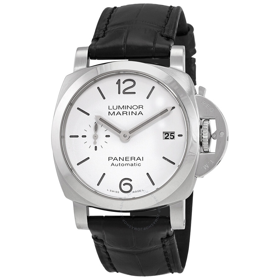 Stainless steel case with a black leather strap. Fixed stainless steel bezel. White dial with index-Arabic numeral hour markers. Dial Type: Analog. One subdial displaying: small second. Panerai Calibre P.900 Automatic movement, based upon Panerai OP XXXIV, containing 25 Jewels, bitting at 28800 vph, and has a power reserve of approximately 72 hours. Scratch resistant sapphire crystal. Pull / push crown. Solid case back. Round case shape, case size: 40 mm. Tang clasp. Water resistant at 100 meters / 330 feet. Functions: date, hour, minute, small second. Luminor Series. Luxury watch style. Watch label: Swiss Made. Panerai Luminor Quaranta Automatic White Dial Men's Watch PAM01371. INFORMATION Brand: Panerai Series: Luminor Collection Name: Luminor Gender: Mens Model: PAM01371 Watch Label: Swiss Made Movement: Automatic Engine: Panerai Calibre P.900 Power Reserve: 72 hours CASE Case Size: 40 mm Case Material: Stainless Steel Case Shape: Round Case Back: Solid BAND Band Material: Alligator Leather Band Type: Strap Band Color: Black Clasp: Tang DIAL Dial Color: White Type: Analog Crystal: Scratch Resistant Sapphire Dial Markers: Index-Arabic Numeral Sub Dials: One - Small Second Bezel: Fixed Bezel Material: Stainless Steel Crown: Pull / Push FEATURES Water Resistance: 100 meters / 330 feet Functions: Date, Hour, Minute, Small Second Watch Features: Stainless Steel, Leather, Analog ADDITIONAL INFO Watch Style: Luxury Warranty: 2 Year Jomashop Warranty Jomashop Sku: PAM01371 Department: Watches Category: Watches