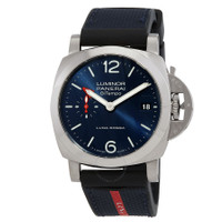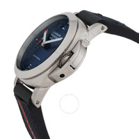 Silver-tone stainless steel case with a blue leather strap. Fixed silver-tone stainless steel bezel. Blue dial with silver-tone hands and index hour markers. Minute markers around the outer rim. Dial Type: Analog. Luminescent hands and markers. Date display at the 3 o'clock position. Panerai Calibre P.900/GMT automatic movement with a 72-hour power reserve. Scratch resistant sapphire crystal. Transparent see through case back. Round case shape, case size: 40 mm. Water resistant at 100 meters / 330 feet. Functions: date, GMT, second time zone, hour, minute, second. Luminor Quaranta Bitempo Luna Rossa Series. Luxury watch style. Watch label: Swiss Made. Panerai Luminor Quaranta Bitempo Luna Rossa GMT Automatic Blue Dial Men's Watch PAM01404. CASE Case Size: 40 Case Material: Stainless Steel Case Shape: Round Case Back: Transparent See Through BAND Band Material: Leather Band Type: Strap Band Color: Blue DIAL Dial Color: Blue Type: Analog Crystal: Scratch Resistant Sapphire Hands: Silver-tone Dial Markers: Index Second Markers: Minute Markers around the outer rim Luminiscence: Hands and Markers Bezel: Fixed Bezel Color: Silver-tone Bezel Material: Stainless Steel INFORMATION Brand: Panerai Series: Luminor Collection Name: Luminor Quaranta Bitempo Luna Rossa Gender: Mens Model: PAM01404 Watch Label: Swiss Made Movement: Automatic Engine: Panerai Calibre P.900/GMT Power Reserve: 72 hours FEATURES Water Resistance: 100 meters / 330 feet Calendar: Date display at the 3 o'clock position Functions: Date, GMT, Second Time Zone, Hour, Minute, Second Watch Features: Analog, GMT, Leather, Stainless Steel, Time Zone ADDITIONAL INFO Watch Style: Luxury Warranty: 2 Year Jomashop Warranty Additional Info: Original Box, International Warranty Card, Manual (Complete Accessories) Jomashop Sku: PAM01404 Department: Watches Category: Watches