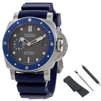 Stainless steel case with a blue rubber strap. Uni-directional rotating coin edge stainless steel bezel with a blue ceramic (count-up elapsed time) ring. Grey dial with luminous silver-tone skeleton sword-shaped hands and dot hour markers. Dial Type: Analog. Luminescent hands and markers. Date display at the 3 o'clock position. Small seconds sub-dial at the 9 o'clock position. Panerai calibre OP XXXIV Automatic movement, containing 25 Jewels, bitting at 28800 vph, and has a power reserve of approximately 72 hours. Scratch resistant sapphire crystal. Pull / push crown. Solid case back. Cushion case shape. Case size: 42 mm. Band width: 22 mm / 20 mm. Tang clasp. Water resistant at 300 meters / 1000 feet. Functions: date, hour, minute, small second. Additional Info: original box, international warranty card, manual (complete accessories). Submersible Series. Dive watch style. Watch label: Swiss Made. Panerai Luminor Submersible Grey Dial Men's Watch PAM00959. GENERAL Box Type: Original Box CASE Case Size: 42 Case Material: Stainless Steel Case Shape: Cushion Case Back: Solid BAND Band Material: Rubber Band Type: Strap Band Color: Blue Band Width: 22 mm / 20 mm Clasp: Tang DIAL Dial Color: Grey Type: Analog Crystal: Scratch Resistant Sapphire Hands: Luminous Silver-tone Skeleton Sword-shaped Dial Markers: Dot Sub Dials: Small Seconds Luminiscence: Hands and Markers Bezel: Uni-directional Rotating Coin Edge Bezel Color: Blue Bezel Material: Stainless Steel with a Blue Ceramic (Count-Up Elapsed Time) Ring Crown: Pull / Push INFORMATION Brand: Panerai Series: Submersible Collection Name: Submersible Gender: Mens Model: PAM00959 Watch Label: Swiss Made Movement: Automatic Engine: Panerai Calibre OP XXXIV Power Reserve: 72 hours FEATURES Water Resistance: 300 meters / 1000 feet Calendar: Date display at the 3 o'clock position Functions: Date, Hour, Minute, Small Second Watch Features: Stainless Steel, Rubber, Ceramic, Analog ADDITIONAL INFO Watch Style: Dive Warranty: 2 Year Jomashop Warranty UPC Code: 7613375190257 Additional Info: Original Box, Manual (Complete Accessories) Jomashop Sku: PAM00959 Department: Watches Category: Watches