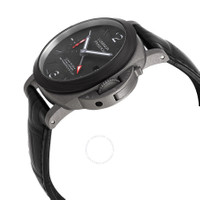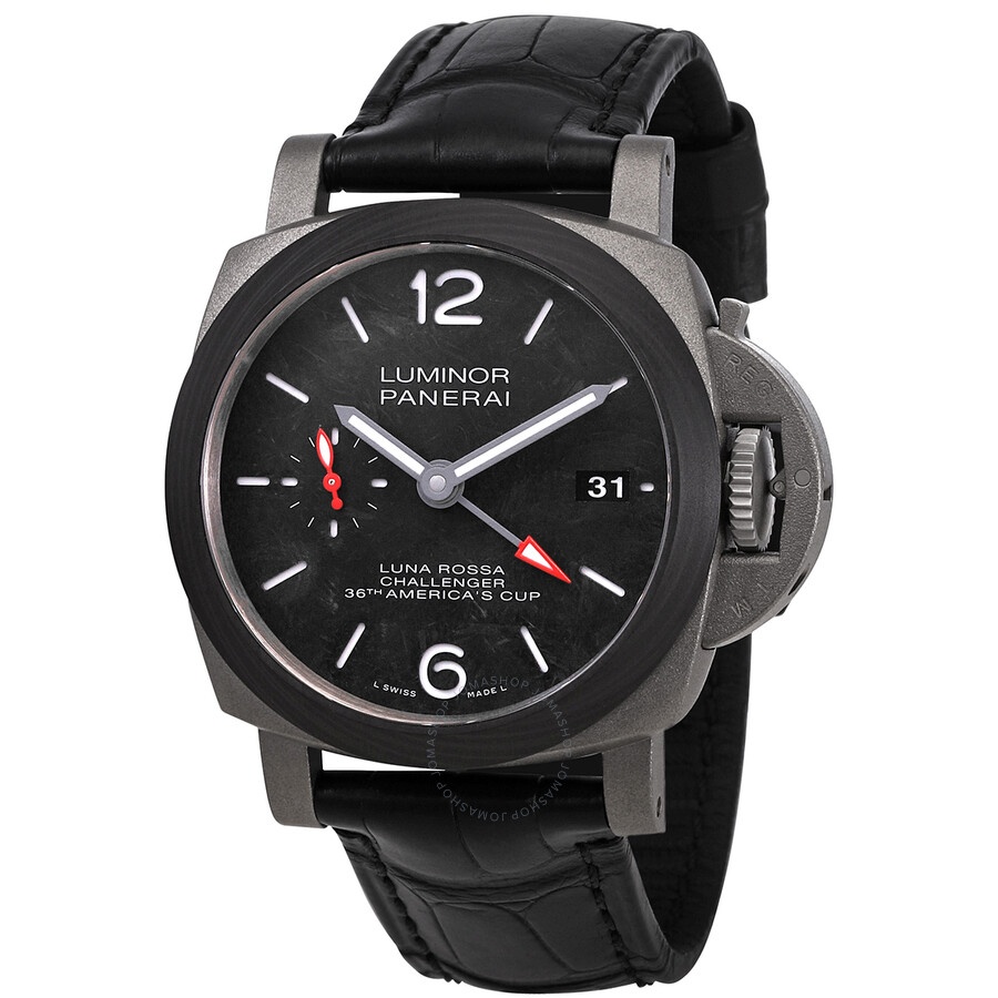 Grey titanium case with a black alligator band. Fixed black titanium bezel. Black dial with black hands and Arabic numeral & index hour markers. Dial Type: Analog. Luminescent hands and markers. Date display at the 3 o'clock position. Automatic movement. Scratch resistant sapphire crystal. Screw down crown. Cushion case shape, case size: 42 mm. Functions: date, hour, minute, second. Luna Rossa Series. Casual watch style. Watch label: Swiss Made. Panerai Luna Rossa Automatic Black Dial Men's Watch PAM01096. GENERAL Box Type: Original Box CASE Case Size: 42 Case Material: Titanium Case Shape: Cushion BAND Band Material: Alligator Band Type: Strap Band Color: Black DIAL Dial Color: Black Type: Analog Crystal: Scratch Resistant Sapphire Hands: Black Dial Markers: Arabic Numeral & Index Luminiscence: Hands and Markers Bezel: Fixed Bezel Color: Black Bezel Material: Titanium Crown: Screw Down INFORMATION Brand: Panerai Series: Luna Rossa Collection Name: Luna Rossa Gender: Mens Model: PAM01096 Watch Label: Swiss Made Movement: Automatic FEATURES Calendar: Date display at the 3 o'clock position Functions: Date, Hour, Minute, Second Watch Features: Alligator Leather, Analog, GMT, Titanium ADDITIONAL INFO Watch Style: Casual Warranty: 2 Year Jomashop Warranty Jomashop Sku: PAM01096 Department: Watches Category: Watches