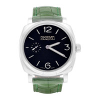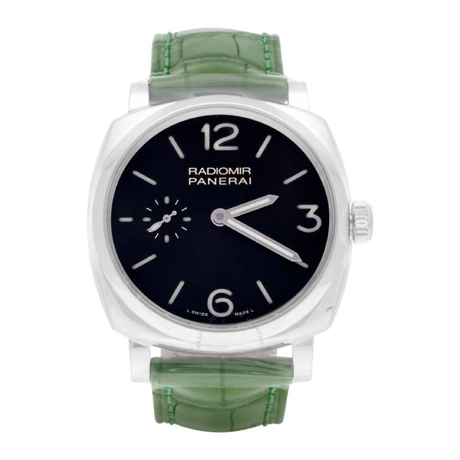 Silver-tone stainless steel case with a brown leather strap. Fixed silver-tone stainless steel bezel. Black dial with luminous silver-tone hands and index hour markers. Arabic numerals mark the 6 and 12 o'clock positions. Dial Type: Analog. Luminescent hands and markers. Small seconds sub-dial at the 9 o'clock position subdials. Panerai Calibre P.1000 Hand Wind movement, containing 21 Jewels, composed of 152 parts, bitting at 21600 vph, and has a power reserve of approximately 72 hours. Scratch resistant sapphire crystal. Screw down crown. Transparent case back. Cushion case shape, case size: 42 mm, case thickness: 11.5 mm. Band width: 22 mm. Tang clasp. Water resistant at 100 meters / 330 feet. Functions: hour, minute, second. Luxury watch style. Watch label: Swiss Made. Panerai Radiomir 1940 3 Day Black Dial Men's Watch PAM00574. GENERAL Box Type: Original Box CASE Case Size: 42 Case Thickness: 11.5 mm Case Material: Stainless Steel Case Shape: Cushion Case Back: Transparent BAND Band Material: Leather Band Type: Strap Band Color: Brown Band Width: 22 mm Clasp: Tang DIAL Dial Color: Black Type: Analog Crystal: Scratch Resistant Sapphire Hands: Luminous Silver-tone Dial Markers: Index Second Markers: Arabic Numerals mark the 6 and 12 o'clock positions Sub Dials: One - Small Second at the 9 o'clock position Luminiscence: Hands and Markers Bezel: Fixed Bezel Color: Silver-tone Bezel Material: Stainless Steel Crown: Screw Down INFORMATION Brand: Panerai Series: Radiomir Collection Name: Radiomir 1940 3 Days Gender: Mens Model: PAM00574 Watch Label: Swiss Made Movement: Hand Wind Engine: Panerai Calibre P.1000 Power Reserve: 72 hours FEATURES Water Resistance: 100 meters / 330 feet Functions: Hour, Minute, Second Watch Features: Stainless Steel, Analog, Leather ADDITIONAL INFO Watch Style: Luxury Warranty: 2 Year Jomashop Warranty UPC Code: 7613268347133 Jomashop Sku: PAM00574 Department: Watches Category: Watches