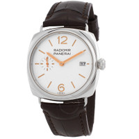 Silver-tone stainless steel case with a brown alligator band. Fixed silver-tone stainless steel bezel. White dial with rose gold-tone hands and index hour markers. Dial Type: Analog. Date display at the 3 o'clock position. One subdial displaying: small second. Panerai Calibre P.900 Automatic movement, based upon Panerai OP XXXIV, containing 25 Jewels, bitting at 28800 vph, and has a power reserve of approximately 72 hours. Scratch resistant sapphire crystal. Solid case back. Round case shape, case size: 40 mm. Water resistant at 30 meters / 100 feet. Functions: date, hour, minute, small second. Additional Info: original box, manual (complete accessories). Radiomir Series. Luxury watch style. Watch label: Swiss Made. Panerai Radiomir Quaranta 40mm Automatic White Dial Men's PAM01570. GENERAL Box Type: Original Box CASE Case Size: 40 Case Material: Stainless Steel Case Shape: Round Case Back: Solid BAND Band Material: Alligator Band Type: Strap Band Color: Brown DIAL Dial Color: White Type: Analog Crystal: Scratch Resistant Sapphire Hands: Rose Gold-tone Dial Markers: Index Sub Dials: One - Small Second Bezel: Fixed Bezel Color: Silver-tone Bezel Material: Stainless Steel INFORMATION Brand: Panerai Series: Radiomir Collection Name: Radiomir Gender: Mens Model: PAM01570 Watch Label: Swiss Made Movement: Automatic Engine: Panerai Calibre P.900 Power Reserve: 72 hours FEATURES Water Resistance: 30 meters / 100 feet Calendar: Date display at the 3 o'clock position Functions: Date, Hour, Minute, Small Second Watch Features: Alligator Leather, Analog, Gold, Stainless Steel ADDITIONAL INFO Watch Style: Luxury Warranty: 2 Year Jomashop Warranty Additional Info: Original Box, Manual (Complete Accessories) Jomashop Sku: PAM01570 Department: Watches