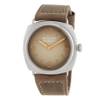Silver-tone stainless steel case with a brown leather strap. Fixed silver-tone stainless steel bezel. Beige dial with gold-tone hands and Arabic numeral hour markers. Dial Type: Analog. One subdial displaying: small second. Panerai Calibre P.6000 Hand Wind movement, containing 19 Jewels, bitting at 21600 vph, and has a power reserve of approximately 72 hours. Scratch resistant sapphire crystal. Round case shape, case size: 45 mm. Water resistant at 100 meters / 330 feet. Functions: hour, minute. Additional Info: original box, international warranty card, manual (complete accessories). Radiomir Tre Giorni Series. Luxury watch style. Watch label: Swiss Made. Panerai Radiomir Tre Giorni Hand Wind Men's Watch PAM01350. INFORMATION Brand: Panerai Series: Radiomir Tre Giorni Collection Name: Radiomir Tre Giorni Gender: Mens Model: PAM01350 Watch Label: Swiss Made Movement: Hand Wind Engine: Panerai Calibre P.6000 Power Reserve: 72 hours CASE Case Size: 45 mm Case Material: Stainless Steel Case Shape: Round BAND Band Material: Leather Band Type: Strap Band Color: Brown DIAL Dial Color: Beige Type: Analog Crystal: Scratch Resistant Sapphire Hands: Gold-tone Dial Markers: Arabic Numeral Sub Dials: One - Small Second Bezel: Fixed Bezel Color: Silver-tone Bezel Material: Stainless Steel FEATURES Water Resistance: 100 meters / 330 feet Functions: Hour, Minute Watch Features: Stainless Steel, Leather, Gold, Analog ADDITIONAL INFO Watch Style: Luxury Warranty: 2 Year Jomashop Warranty Additional Info: Original Box, International Warranty Card, Manual (Complete Accessories) Jomashop Sku: PAM01350 Item Variation: PAM1350 Department: Watches Category: Watches