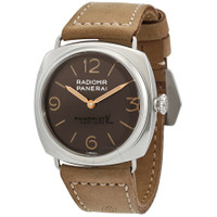 Stainless steel case with a brown leather strap. Fixed stainless steel bezel. Brown dial with index-Arabic numeral hour markers. Dial Type: Analog. One subdial displaying: small second. Panerai Calibre P.6000 Hand Wind movement, containing 19 Jewels, bitting at 21600 vph, and has a power reserve of approximately 72 hours. Scratch resistant sapphire crystal. Screw down crown. Solid case back. Round case shape, case size: 45. Water resistant at 100 meters / 330 feet. Functions: hour, minute, small second. Radiomir Series. Luxury watch style. Watch label: Swiss Made. Panerai Radiomir Venti Hand Wind Brown Dial Men's Watch PAM02020. CASE Case Size: 45 Case Material: Stainless Steel Case Shape: Round Case Back: Solid BAND Band Material: Leather Band Type: Strap Band Color: Brown DIAL Dial Color: Brown Type: Analog Crystal: Scratch Resistant Sapphire Dial Markers: Index-Arabic Numeral Sub Dials: One - Small Second Bezel: Fixed Bezel Material: Stainless Steel Crown: Screw Down INFORMATION Brand: Panerai Series: Radiomir Collection Name: Radiomir Gender: Mens Model: PAM02020 Watch Label: Swiss Made Movement: Hand Wind Engine: Panerai Calibre P.6000 Power Reserve: 72 hours FEATURES Water Resistance: 100 meters / 330 feet Functions: Hour, Minute, Small Second Watch Features: Analog, Leather, Stainless Steel ADDITIONAL INFO Watch Style: Luxury Warranty: 2 Year Jomashop Warranty Jomashop Sku: PAM02020 Department: Watches Category: Watches
