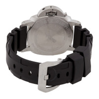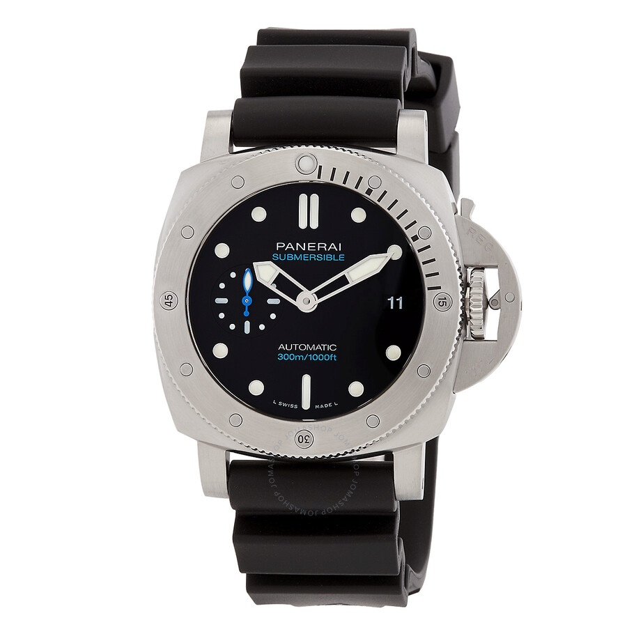 Silver-tone stainless steel case with a black rubber strap. Uni-directional rotating silver-tone stainless steel bezel. Black dial with silver-tone hands and index hour markers. Dial Type: Analog. Luminescent hands and markers. Date display at the 3 o'clock position. One subdial displaying: small second. Panerai Calibre P.900 Automatic movement, based upon Panerai OP XXXIV, containing 25 Jewels, bitting at 28800 vph, and has a power reserve of approximately 72 hours. Scratch resistant sapphire crystal. Screw down crown. Round case shape, case size: 42 mm. Water resistant at 300 meters / 1000 feet. Functions: date, hour, minute, small second. Additional Info: original box,manual (complete accessories). Submersible Series. Dive watch style. Watch label: Swiss Made. Panerai Submersible 42mm Automatic Black Dial Men's Watch PAM01591. GENERAL Box Type: Original Box CASE Case Size: 42 Case Material: Stainless Steel Case Shape: Round BAND Band Material: Rubber Band Type: Strap Band Color: Black DIAL Dial Color: Black Type: Analog Crystal: Scratch Resistant Sapphire Hands: Silver-tone Dial Markers: Index Sub Dials: One - Small Second Luminiscence: Hands and Markers Bezel: Uni-directional Rotating Bezel Color: Silver-tone Bezel Material: Stainless Steel Crown: Screw Down INFORMATION Brand: Panerai Series: Submersible Collection Name: Submersible Gender: Mens Model: PAM01591 Watch Label: Swiss Made Movement: Automatic Engine: Panerai Calibre P.900 Power Reserve: 72 hours FEATURES Water Resistance: 300 meters / 1000 feet Calendar: Date display at the 3 o'clock position Functions: Date, Hour, Minute, Small Second Watch Features: Analog, Rubber, Stainless Steel ADDITIONAL INFO Watch Style: Dive Warranty: 2 Year Jomashop Warranty Additional Info: Original Box,Manual (Complete Accessories) Jomashop Sku: PAM01591 Department: Watches