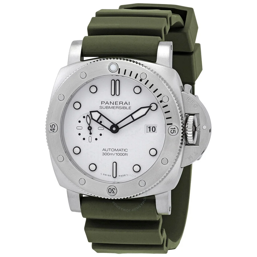 Silver-tone stainless steel case with a green rubber strap. Uni-directional rotating silver-tone brushed stainless steel bezel. White dial with black hands and index hour markers. Minute markers around the outer rim. Dial Type: Analog. Luminescent hands and markers. Date display at the 3 o'clock position. One subdial displaying: one- small seconds. Panerai Calibre P.900 Automatic movement, based upon Panerai OP XXXIV, containing 25 Jewels, bitting at 28800 vph, and has a power reserve of approximately 72 hours. Scratch resistant sapphire crystal. Screw down crown. Solid case back. Cushion case shape, case size: 44 mm. Band length: 24.0/22.0 mm. Buckle clasp. Water resistant at 300 meters / 1000 feet. Functions: date, hour, minute, second. Submersible Quarantaquattro Series. Luxury watch style. Watch label: Swiss Made. Panerai Submersible 44mm QuarantaQuattro Automatic White Dial Men's Watch PAM01595. CASE Case Size: 44 Case Material: Stainless Steel Case Shape: Cushion Case Back: Solid BAND Band Material: Rubber Band Type: Strap Band Color: Green Band Length: 24.0/22.0 mm Clasp: Buckle DIAL Dial Color: White Type: Analog Crystal: Scratch Resistant Sapphire Hands: Black Dial Markers: Index Second Markers: Minute Markers around the outer rim Sub Dials: One- Small Seconds Luminiscence: Hands and Markers Bezel: Uni-directional Rotating Bezel Color: Silver-tone Bezel Material: Brushed Stainless Steel Crown: Screw Down INFORMATION Brand: Panerai Series: Submersible Collection Name: Submersible QuarantaQuattro Gender: Mens Model: PAM01595 Watch Label: Swiss Made Movement: Automatic Engine: Panerai Calibre P.900 Power Reserve: 3 days FEATURES Water Resistance: 300 meters / 1000 feet Calendar: Date display at the 3 o'clock position Functions: Date, Hour, Minute, Second Watch Features: Stainless Steel, Rubber, Analog ADDITIONAL INFO Watch Style: Luxury Warranty: 2 Year Jomashop Warranty Jomashop Sku: PAM01595 Department: Watches