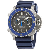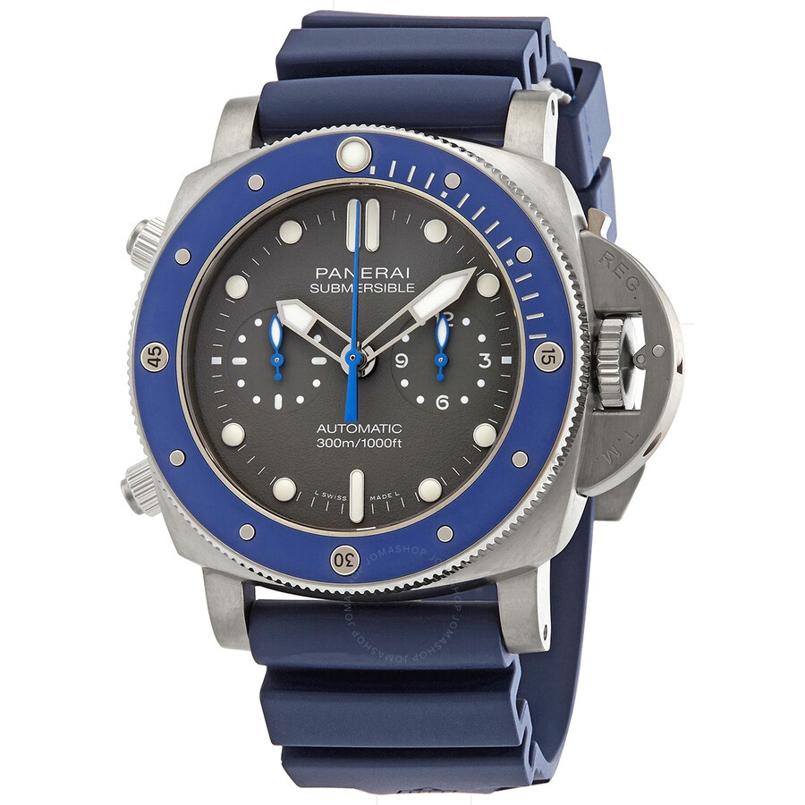 Grey titanium case with a blue rubber strap. Uni-directional rotating grey titanium bezel with an inlaid blue ceramic ring. Shark grey dial with luminous silver-tone hands and dot hour markers. Minute markers around the outer rim. Dial Type: Analog. Luminescent hands and markers. Panerai calibre P.9100 automatic movement, containing 37 Jewels, composed of 302 parts, bitting at 28800 vph, and has a power reserve of approximately 72 hours. Scratch resistant sapphire crystal. Pull / push crown. Solid case back. Cushion case shape. Case size: 47 mm. Band width: 26 mm / 22 mm. Tang clasp. Water resistant at 300 meters / 1000 feet. Functions: chronograph, column wheel, flyback, date, hour, minute, second. Submersible Chrono Guillaume Nery Edition Series. Dive watch style. Watch label: Swiss Made. Panerai Submersible Chrono Guillaume Nery Edition Chronograph Automatic Shark Grey Dial Men's 47 mm Watch PAM00982. GENERAL Box Type: Original Box CASE Case Size: 47 Case Material: Titanium Case Shape: Cushion Case Back: Solid BAND Band Material: Rubber Band Type: Strap Band Color: Blue Band Width: 26 mm / 22 mm Clasp: Tang DIAL Dial Color: Shark Grey Type: Analog Crystal: Scratch Resistant Sapphire Hands: Luminous Silver-tone Dial Markers: Dot Second Markers: Minute Markers around the outer rim Luminiscence: Hands and Markers Bezel: Uni-directional Rotating Bezel Color: Grey Bezel Material: Titanium and with a Blue Ceramic Ring Crown: Pull / Push INFORMATION Brand: Panerai Series: Submersible Collection Name: Submersible Chrono Guillaume Nery Edition Gender: Mens Model: PAM00982 Watch Label: Swiss Made Movement: Automatic Engine: Panerai Calibre P.9100 Power Reserve: 72 hours FEATURES Water Resistance: 300 meters / 1000 feet Functions: Chronograph, Column Wheel, FlyBack, Date, Hour, Minute, Second Watch Features: Analog, Flyback, Ceramic, Rubber, Titanium, Chronograph ADDITIONAL INFO Watch Style: Dive Warranty: 2 Year Jomashop Warranty UPC Code: 7613375195115 Jomashop Sku: PAM00982 Department: Watches Category: Watches