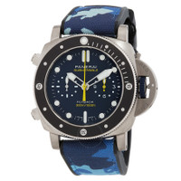Grey titanium case with a blue rubber strap. Uni-directional rotating grey titanium bezel with an inlaid black ring. Blue dial with luminous silver-tone hands and dot hour markers. Minute markers around the outer rim. Dial Type: Analog. Luminescent hands and markers. Chronograph - two sub-dials displaying: small seconds and 12 hours. Panerai calibre P.9100 automatic movement, containing 37 Jewels, composed of 302 parts, bitting at 28800 vph, and has a power reserve of approximately 72 hours. Scratch resistant sapphire crystal. Screw down crown. Solid case back. Cushion case shape. Case size: 47 mm. Band width: 26 mm. Tang clasp. Water resistant at 300 meters / 1000 feet. Functions: chronograph, column wheel, flyback, date, hour, minute, second. Additional Info: original box, manual (complete accessories). Submersible Series. Luxury watch style. Watch label: Swiss Made. Item Variations: Mike Horn Edition. Panerai Submersible Chronograph Automatic Blue Dial Men's Watch PAM01291. GENERAL Box Type: Original Box CASE Case Size: 47 Case Material: Titanium Case Shape: Cushion Case Back: Solid BAND Band Material: Rubber Band Type: Strap Band Color: Blue Band Width: 26 mm Clasp: Tang DIAL Dial Color: Blue Type: Analog Crystal: Scratch Resistant Sapphire Hands: Luminous Silver-tone Dial Markers: Dot Second Markers: Minute Markers around the outer rim Sub Dials: Two - Small Seconds and 12 Hours Luminiscence: Hands and Markers Bezel: Uni-directional Rotating Bezel Color: Grey Bezel Material: Titanium with an inlaid Black Ring Crown: Screw Down INFORMATION Brand: Panerai Series: Submersible Collection Name: Submersible Gender: Mens Model: PAM01291 Watch Label: Swiss Made Movement: Automatic Engine: Panerai Calibre P.9100 Power Reserve: 72 hours FEATURES Water Resistance: 300 meters / 1000 feet Functions: Chronograph, Column Wheel, FlyBack, Date, Hour, Minute, Second Watch Features: Analog, Flyback, Rubber, Titanium, Chronograph ADDITIONAL INFO Watch Style: Luxury Warranty: 2 Year Jomashop Warranty Additional Info: Original Box, Manual (Complete Accessories) Jomashop Sku: PAM01291 Item Variation: Mike Horn Edition Department: Watches Category: Watches