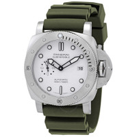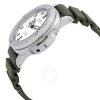 Stainless steel case with a military green rubber strap. Uni-directional rotating brushed stainless steel bezel. White dial with black hands and index hour markers. Minute markers around the outer rim. Dial Type: Analog. Luminescent hands and markers. Date display at the 3 o'clock position. One subdial displaying: one- small seconds. Panerai Calibre P.900 Automatic movement, based upon Panerai OP XXXIV, containing 25 Jewels, bitting at 28800 vph, and has a power reserve of approximately 72 hours. Scratch resistant sapphire crystal. Screw down crown. Solid case back. Cushion case shape, case size: 44 mm. Band length: 24.0/22.0 mm. Buckle clasp. Water resistant at 300 meters / 1000 feet. Functions: date, hour, minute, second. Submersible Quarantaquattro Series. Luxury watch style. Watch label: Swiss Made. Panerai Submersible QuarantaQuattro Automatic White Dial Men's Watch PAM01226. INFORMATION Brand: Panerai Series: Submersible Quarantaquattro Collection Name: Submersible QuarantaQuattro Gender: Mens Model: PAM01226 Watch Label: Swiss Made Movement: Automatic Engine: Panerai Calibre P.900 Power Reserve: 3 days CASE Case Size: 44 mm Case Material: Stainless Steel Case Shape: Cushion Case Back: Solid BAND Band Material: Rubber Band Type: Strap Band Color: Military Green Band Length: 24.0/22.0 mm Clasp: Buckle DIAL Dial Color: White Type: Analog Crystal: Scratch Resistant Sapphire Hands: Black Dial Markers: Index Second Markers: Minute Markers around the outer rim Sub Dials: One- Small Seconds Luminiscence: Hands and Markers Bezel: Uni-directional Rotating Bezel Material: Brushed Stainless Steel Crown: Screw Down FEATURES Water Resistance: 300 meters / 1000 feet Calendar: Date display at the 3 o'clock position Functions: Date, Hour, Minute, Second Watch Features: Stainless Steel, Rubber, Analog ADDITIONAL INFO Watch Style: Luxury Warranty: 2 Year Jomashop Warranty Jomashop Sku: PAM01226 Department: Watches Category: Watches