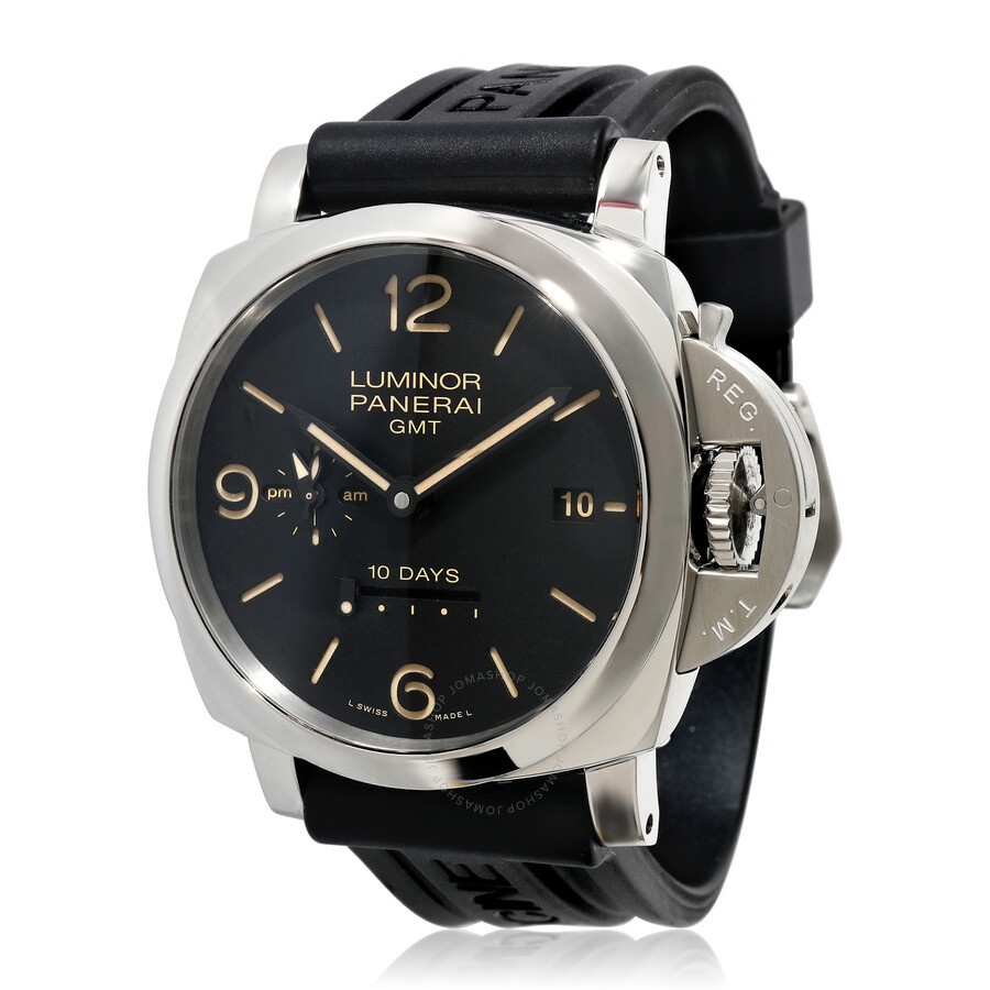 Pre-owned Stainless steel case with a brown leather strap. Fixed stainless steel bezel. Black dial with luminous black hands and index hour markers. Arabic numerals mark the 6, 9 and 12 o'clock positions. Dial Type: Analog. Luminescent hands and markers. Date display at the 3 o'clock position. Two sub-dials displaying: 24 hour and power reserve indicator. Panerai calibre P.2003 automatic movement, containing 25 Jewels, composed of 281 parts, bitting at 28800 vph, and has a power reserve of approximately 240 hours. Scratch resistant sapphire crystal. Screw down crown. Skeleton case back. Cushion case shape. Case size: 44 mm. Case thickness: 8 mm. Band width: 22.9 mm. Band length: 9 inches. Tang clasp. Water resistant at 100 meters / 330 feet. Functions: GMT, second time zone, date, hour, minute, small second, power reserve indicator, day/night indicator. Luminor 1950 10 Days Gmt Series. Luxury watch style. Watch label: Swiss Made. Panerai Luminor 1950 10 Days GMT Automatic Black Dial Men's Watch PAM00533. GENERAL Collection Name: Luminor 1950 10 Days Gmt INFORMATION Brand: Panerai Series: Luminor Model: PAM00533 Gender: Mens Watch Label: Swiss Made Movement: Automatic Engine: Panerai Calibre P.2003 Power Reserve: 240 hours / 10 days CONDITION INFORMATION Box: Yes Preowned Item Condition: Excellent Papers: No Comments: Fits wrist size 8 inches. Retail price 13400 USD. In excellent condition and recently serviced. All components are factory original. Photos of actual watch. Paneria Calibre P.2003, 25 Jewels. Comes with the original box and instructions. CASE Case Size: 44 Case Thickness: 8 mm Case Material: Stainless Steel Case Shape: Cushion Case Back: Skeleton DIAL Type: Analog Dial Color: Black Crystal: Scratch Resistant Sapphire Hands: Luminous Black Second Markers: Arabic Numerals mark the 6, 9 and 12 o'clock positions Dial Markers: Index Sub Dials: Two - 24 Hour and Power Reserve Indicator Luminiscence: Hands and Markers Bezel: Fixed Bezel Color: Silver-tone Bezel Material: Stainless Steel Crown: Screw Down BAND Band Type: Strap Band Material: Rubber Band Color: Black Band Length: 8.00 inches Band Width: 22.9 mm Clasp: Tang FEATURES Water Resistance: 100 meters / 330 feet Calendar: Date display at the 3 o'clock position Functions: GMT, Second Time Zone, Date, Hour, Minute, Small Second, Power Reserve Indicator, Day/Night Indicator Watch Features: Day/Night Indicator, Power Reserve Indicator, GMT, Analog, Leather, Stainless Steel, Time Zone ADDITIONAL INFO Watch Style: Luxury Warranty: 1 Year Jomashop Warranty UPC Code: 7613268347256 Additional Info: Includes Box, Instructions Jomashop Sku: PRE-P-PAM72075 Department: Watches Category: Watches
