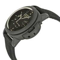 Pre-owned Black ceramic case with a black leather strap. Fixed black ceramic bezel. Black dial with luminous hands and index hour markers. Arabic numerals mark the 6 and 12 o'clock positions. minute markers around the outer rim. Dial Type: Analog. Luminescent hands and markers. Linear power reserve indicator at 6 o'clock. Three sub-dials displaying: 24 hour/60 second, 30 minute and power reserve indicator. Panerai Calibre P.2004 Hand Wind movement, based upon Panerai P.2002, containing 29 Jewels, composed of 321 parts, bitting at 28800 vph, and has a power reserve of approximately 72 hours. Scratch resistant sapphire crystal. Screw down crown. Transparent case back. Cushion case shape, case size: 44 mm, case thickness: 17.5 mm. Band width: 22.9 mm, band length: 9 inches. Ceramic tang clasp. Water resistant at 100 meters / 330 feet. Functions: chronograph, column wheel, GMT, second time zone, hour, minute, small second, power reserve indicator. Luminor 1950 Chrono Monopulsante 8 Days Gmt Series. Luxury watch style. Watch label: Swiss Made. Panerai Luminor 1950 Chronograph Men's Watch PAM00317. GENERAL Preowned Item Condition: Excellent CASE Case Thickness: 17.5 mm Case Material: Ceramic Case Shape: Cushion Case Back: Transparent BAND Band Material: Leather Band Type: Strap Band Color: Black Band Width: 22.9 mm Clasp: Ceramic Tang DIAL Dial Color: Black Type: Analog Crystal: Scratch Resistant Sapphire Hands: Luminous Dial Markers: Index Second Markers: Arabic Numerals mark the 6 and 12 o'clock positions. Minute Markers around the outer rim Sub Dials: Three - 24 Hour/60 Second, 30 Minute and Power Reserve Indicator Luminiscence: Hands and Markers Bezel: Fixed Bezel Color: Black Bezel Material: Ceramic Crown: Screw Down INFORMATION Brand: Panerai Series: Luminor Collection Name: Luminor 1950 Chrono Monopulsante 8 Days Gmt Gender: Mens Model: PAM00317 Watch Label: Swiss Made Movement: Hand Wind Engine: Panerai Calibre P.2004 Power Reserve: 192 hours FEATURES Water Resistance: 100 meters / 330 feet Calendar: Linear Power Reserve indicator at 6 o'clock Functions: Chronograph, Column Wheel, GMT, Second Time Zone, Hour, Minute, Small Second, Power Reserve Indicator Watch Features: Power Reserve Indicator, GMT, Analog, Ceramic, Leather, Chronograph, Time Zone ADDITIONAL INFO Watch Style: Luxury Warranty: 1 Year Jomashop Warranty UPC Code: 4100003362429 Jomashop Sku: PRE-P-PAM101127 Department: Watches Category: Watches