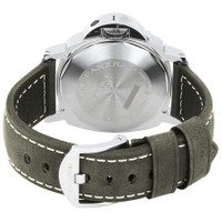 Pre-owned Stainless steel case with a olive grey (calfskin) leather strap. Fixed stainless steel bezel. Black dial with luminous silver-tone hands and index hour markers. Arabic numerals mark the 6 and 12 o'clock poisitions. Minute markers around the outer rim. Dial Type: Analog. Luminescent hands and markers. Date display at the 3 o'clock position. Two sub-dials displaying: small seconds, and power reserve. Panerai calibre OP XXXIII hand wind movement, based upon ETA 2801-2, containing 17 Jewels, bitting at 28800 vph, and has a power reserve of approximately 42 hours. Scratch resistant sapphire crystal. Screw down crown. Solid case back. Cushion case shape. Case size: 44 mm. Case thickness: 15.8 mm. Band width: 24 mm. Tang clasp. Water resistant at 300 meters / 1000 feet. Functions: date, hour, minute, second, power reserve. Dive watch style. Watch label: Swiss Made. Panerai Luminor Power Reserve Automatic 44mm Black Dial Men's Watch PAM01090. GENERAL Collection Name: Luminor INFORMATION Brand: Panerai Series: Luminor Model: PAM01090 Gender: Mens Watch Label: Swiss Made Movement: Automatic Engine: Panerai Calibre OP XXXIII Power Reserve: 50 hours CONDITION INFORMATION Box: Yes Preowned Item Condition: Excellent Papers: Yes Year: 2019 CASE Case Size: 44 Case Thickness: 15.8 mm Case Material: Stainless Steel Case Shape: Cushion Case Back: Solid DIAL Type: Analog Dial Color: Black Crystal: Scratch Resistant Sapphire Hands: Luminous Silver-tone Second Markers: Arabic Numerals mark the 6 and 12 o'clock poisitions. Minute Markers around the outer rim Dial Markers: Index Sub Dials: Two - Small Second and Power Reserve Indicator Luminiscence: Hands and Markers Bezel: Fixed Bezel Color: Silver-tone Bezel Material: Stainless Steel Crown: Screw Down BAND Band Type: Strap Band Material: (Calfskin) Leather Band Color: Olive Grey Band Width: 24 mm Clasp: Tang FEATURES Water Resistance: 300 meters / 1000 feet Calendar: Date display at the 3 o'clock position Functions: Date, Hour, Minute, Second, Power Reserve Watch Features: Stainless Steel, Leather, Analog, Power Reserve Indicator ADDITIONAL INFO Watch Style: Dive Warranty: 1 Year Jomashop Warranty UPC Code: 7613268797778 Jomashop Sku: PRE-P-PAM87099 Department: Watches Category: Watches