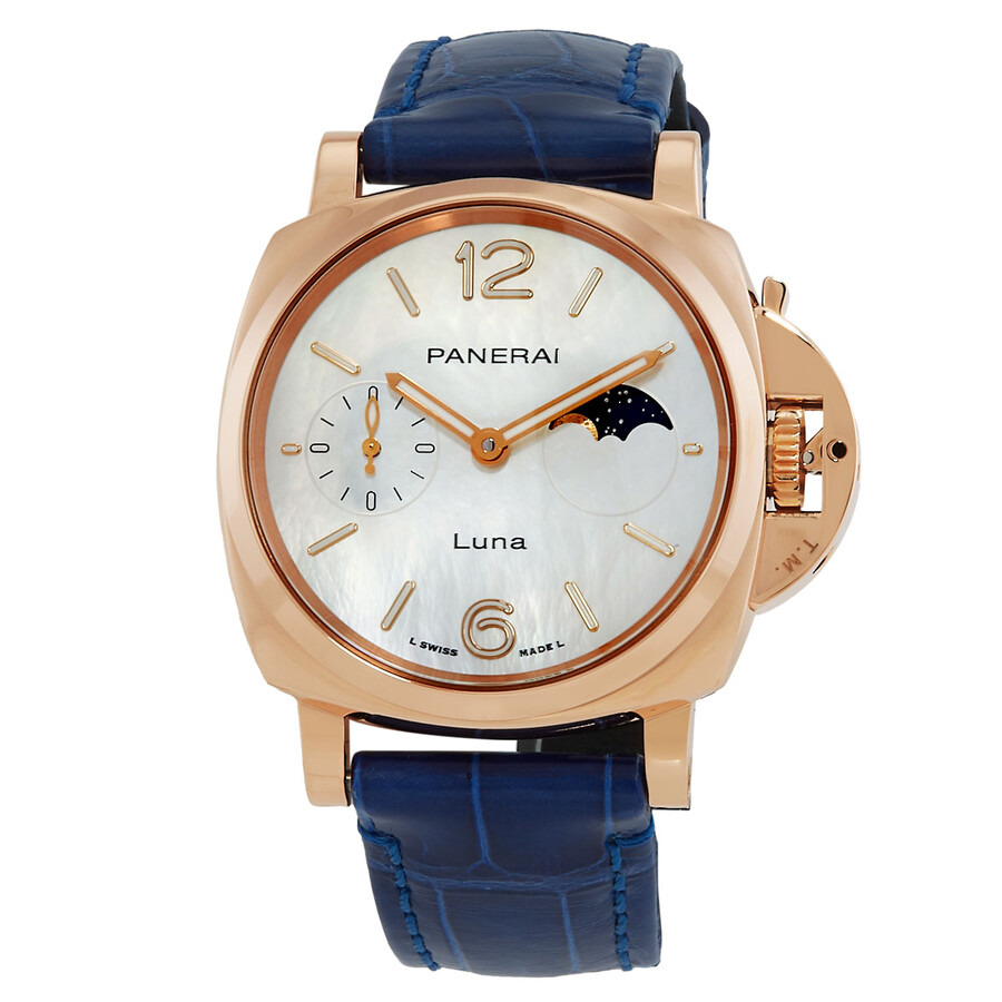 Rose gold-tone 18kt rose gold case with a blue alligator band. Fixed rose gold-tone 18kt rose gold bezel. Mother of pearl dial with rose gold-tone hands and index hour markers. Dial Type: Analog. Luminescent hands and markers. Panerai Calibre P.900/MP automatic movement with a 72-hour power reserve. Scratch resistant sapphire crystal. Transparent see through case back. Cushion case shape, case size: 38 mm. Water resistant at 50 meters / 165 feet. Functions: moon phase, hours, small seconds, minutes. Luminor Due Luna Goldtech Series. Luxury watch style. Watch label: Swiss Made. Pre-owned Panerai Luminor Due Luna Goldtech Mother of Pearl Dial Men's Watch PAM01181. GENERAL Preowned Item Condition: Excellent CASE Case Material: 18kt Rose Gold Case Shape: Cushion Case Back: Transparent See Through BAND Band Material: Alligator Band Type: Strap Band Color: Blue DIAL Dial Color: Mother of Pearl Type: Analog Crystal: Scratch Resistant Sapphire Hands: Rose Gold-tone Dial Markers: Index Luminiscence: Hands and Markers Bezel: Fixed Bezel Color: Rose Gold-tone Bezel Material: 18kt Rose Gold INFORMATION Brand: Panerai Series: Luminor Due Luna Goldtech Collection Name: Luminor Due Luna Goldtech Gender: Mens Model: PAM01181 Watch Label: Swiss Made Movement: Automatic Engine: Panerai Calibre P.900/MP Power Reserve: 72 hours FEATURES Water Resistance: 50 meters / 165 feet Functions: Moon phase, Hours, Small seconds, Minutes Watch Features: Alligator Leather, Analog, Gold, Moon Phase ADDITIONAL INFO Watch Style: Luxury Warranty: 1 Year Jomashop Warranty Jomashop Sku: PRE-P-PAM101601 Department: Watches Category: Watches