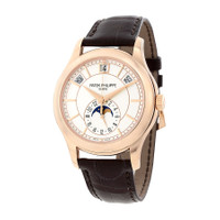 18kt rose gold case with a brown alligator leather strap. Fixed 18kt rose gold bezel. Opaline white dial with rose gold dauphine-style shape hands and Roman numeral hour markers. Minute markers around the outer rim. Dial Type: Analog. Day of the week display. date display. month display. One subdial displaying: moon phase/24 hour. Patek Philippe Calibre 324 S QA LU 24H/206 Automatic movement, containing 34 Jewels, composed of 356 parts, bitting at 28800 vph, and has a power reserve of approximately 45 hours. Scratch resistant sapphire crystal. Transparent case back. Round case shape, case size: 40 mm, case thickness: 11.36 mm. Band width: 20.3 mm, band length: 8 inches. Tang clasp. Water resistant at 30 meters / 100 feet. Functions: annual calendar, moon phase, month, date, day, GMT, second time zone, hour, minute, second. Additional Info: unsuitable for prolonged contact with water e.g. swimming, bathing. Annual Calendar Series. Luxury watch style. Watch label: Swiss Made. Item Variations: 5205R 001, 5205R.001, 5205R001. Patek Philippe Annual Calendar Opaline White Dial Brown Leather Men's Watch 5205R-001. GENERAL Box Type: Original Box CASE Case Size: 40 Case Thickness: 11.36 mm Case Material: 18kt Rose Gold Case Shape: Round Case Back: Transparent BAND Band Material: Alligator Leather Band Type: Strap Band Color: Brown Band Length: 8 inches Band Width: 20.3 mm Clasp: Tang DIAL Dial Color: Opaline White Type: Analog Crystal: Scratch Resistant Sapphire Hands: Rose Gold Dauphine-style shape Dial Markers: Roman Numeral Second Markers: Minute Markers around the outer rim Sub Dials: One - Moon Phase/24 Hour Bezel: Fixed Bezel Material: 18kt Rose Gold INFORMATION Brand: Patek Philippe Series: Complications Collection Name: Annual Calendar Gender: Mens Model: 5205R-001 Watch Label: Swiss Made Movement: Automatic Engine: Patek Philippe Calibre 324 S QA LU 24H/206 Power Reserve: 45 hours FEATURES Water Resistance: 30 meters / 100 feet Calendar: Day of the Week Display. Date Display. Month Display Functions: Annual Calendar, Moon Phase, Month, Date, Day, GMT, Second Time Zone, Hour, Minute, Second Watch Features: Alligator Leather, Analog, GMT, Annual Calendar, Month, Gold, Leather, Moon Phase, Time Zone ADDITIONAL INFO Watch Style: Luxury Warranty: 2 Year Jomashop Warranty Additional Info: unsuitable for prolonged contact with water e.g. swimming, bathing Jomashop Sku: PK-5205R-001 Item Variation: 5205R 001, 5205R.001, 5205R001 Department: Watches Category: Watches