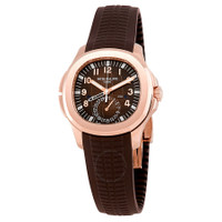 18kt rose gold case with a tropical composite band. Fixed 18kt rose gold bezel. Brown dial with rose gold hands and Arabic numeral hour markers. Minute markers around the outer rim. Dial Type: Analog. Luminescent hands and markers. Date display at the 6 o'clock position. Date subdials. Patek Philippe Calibre 324 S C FUS automatic movement with a 45-hour power reserve. Scratch resistant sapphire crystal. Screw down crown. Sapphire-crystal case back. Cushion case shape, case size: 40.8 mm, case thickness: 10.2 mm. Aquanaut fold-over clasp. Water resistant at 120 meters / 400 feet. Functions: date, second time zone, hour, minute, second, day/night indicator. Casual watch style. Watch label: Swiss Made. Patek Philippe Aquanaut 18kt Rose Gold Automatic Men's Watch 5164R. GENERAL Box Type: Original Box CASE Case Size: 40 Case Thickness: 10.2 mm Case Material: 18kt Rose Gold Case Shape: Cushion Case Back: Sapphire-crystal BAND Band Material: Tropical Composite Clasp: Aquanaut fold-over DIAL Dial Color: Brown Type: Analog Crystal: Scratch Resistant Sapphire Hands: Rose Gold Dial Markers: Arabic Numeral Second Markers: Minute Markers around the outer rim Sub Dials: One - Date Luminiscence: Hands and Markers Bezel: Fixed Bezel Color: 18kt Rose Bezel Material: Gold Crown: Screw Down INFORMATION Brand: Patek Philippe Series: Aquanaut Collection Name: Aquanaut Gender: Mens Model: 5164R-001 Watch Label: Swiss Made Movement: Automatic Engine: Patek Philippe Calibre 324 S C FUS Power Reserve: 45 hours FEATURES Water Resistance: 120 meters / 400 feet Calendar: Date display at the 6 o'clock position Functions: Date, Second Time Zone, Hour, Minute, Second, Day/Night Indicator Watch Features: Analog, Day/Night Indicator, Gold, Time Zone ADDITIONAL INFO Watch Style: Casual Warranty: 2 Year Jomashop Warranty UPC Code: 842047115077 Jomashop Sku: PK-5164R Department: Watches Category: Watches