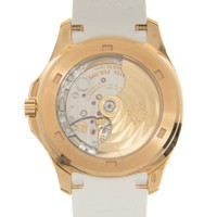 18kt rose gold case with a white rubber strap. Fixed bezel with diamond set. White dial with Arabic numeral hour markers. Dial Type: Analog. Date display at the 3 o'clock position. Patek Philippe Calibre 26-330 S C Automatic movement, containing 30 Jewels, composed of 212 parts, bitting at 28800 vph, and has a power reserve of approximately 45 hours. Scratch resistant sapphire crystal. Screw down crown. Transparent see through case back. Cushion case shape, case size: 38.8 mm, case thickness: 8.5 mm. Deployment clasp. Water resistant at 120 meters / 390 feet. Functions: date, hour, minute, second. Aquanaut Series. Luxury watch style. Watch label: Swiss Made. Patek Philippe Aquanaut Automatic Diamond White Dial Ladies Watch 5268-200R. INFORMATION Brand: Patek Philippe Series: Aquanaut Collection Name: Aquanaut Gender: Womens Model: 5268/200R-001 Watch Label: Swiss Made Movement: Automatic Engine: Patek Philippe Calibre 26-330 S C Power Reserve: 45 hours CASE Case Size: 38.8 mm Case Thickness: 8.5 mm Case Material: 18kt Rose Gold Case Shape: Cushion Case Back: Transparent See Through BAND Band Material: Rubber Band Type: Strap Band Color: White Clasp: Deployment DIAL Dial Color: White Type: Analog Crystal: Scratch Resistant Sapphire Hands: Rose Gold-tone Dial Markers: Arabic Numeral Second Markers: Minute Markers around the outer rim Luminiscence: Hands and Markers Bezel: Fixed Bezel Color: Rose Gold-tone Bezel Material: Diamond Set 18kt Rose Gold Crown: Screw Down FEATURES Water Resistance: 120 meters / 390 feet Calendar: Date display at the 3 o'clock position Functions: Date, Hour, Minute, Second Watch Features: Diamond, Rubber, Gold, Analog ADDITIONAL INFO Watch Style: Luxury Warranty: 2 Year Jomashop Warranty Additional Info: Original Box, Manual (Complete Accessories) Jomashop Sku: PK-5268-200R Department: Watches Category: Watches