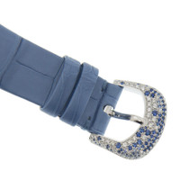 18kt white gold, 149 diamonds ~1.1 ct., 182 blue sapphires ~1.93 ct. case with a blue alligator band. Fixed 98 diamond set bezel. Engraved mother of pearl 98 diamonds ~0.23 ct., 89 blue sapphires: ~0.28 ct dial with silver-tone leaf-style shape hands. Dial Type: Analog. Patek Philippe Calibre 240 Automatic movement, containing 27 Jewels, composed of 161 parts, bitting at 21600 vph, and has a power reserve of approximately 48 hours. Scratch resistant sapphire crystal. 36 diamonds ~0.04 ct., 1 blue sapphire cabochon: ~0.1 ct. crown. Transparent case back. Round case shape, case size: 35.8 mm, case thickness: 7.8 mm. Pin buckle 65 diamonds: ~0.29 ct. 82 blue sapphires: ~0.38 ct. clasp. Water resistant at 30 meters / 100 feet. Functions: hour, minute. Additional Info: original box, international warranty card, manual (complete accessories). Luxury watch style. Watch label: Swiss Made. Item Variations: Total 348 diamonds: ~1.66 ct. Total 354 blue sapphires: ~2.69 ct. Patek Philippe Calatrava Automatic Mother of Pearl and Blue Sapphire Ladies Watch 4899-901G-001. INFORMATION Brand: Patek Philippe Series: Calatrava Collection Name: Calatrava Gender: Womens Model: 4899-901G-001 Watch Label: Swiss Made Movement: Automatic Engine: Patek Philippe Calibre 240 Power Reserve: 48 hours CASE Case Size: 35.8 mm Case Thickness: 7.8 mm Case Material: 18kt White Gold, 149 diamonds ~1.1 ct., 182 blue s Case Shape: Round Case Back: Transparent BAND Band Material: Alligator Band Type: Strap Band Color: Blue Clasp: Pin Buckle 65 diamonds: ~0.29 ct. 82 blue sapphire DIAL Dial Color: Engraved Mother of Pearl 98 diamonds ~0.23 ct., 89 Type: Analog Crystal: Scratch Resistant Sapphire Hands: Silver-tone Leaf-style shape Bezel: Fixed Bezel Material: 98 Diamond Set Crown: 36 diamonds ~0.04 ct., 1 blue sapphire cabochon: ~ FEATURES Water Resistance: 30 meters / 100 feet Functions: Hour, Minute Watch Features: Diamond, Gold, Analog, Alligator Leather ADDITIONAL INFO Watch Style: Luxury Warranty: 2 Year Jomashop Warranty Additional Info: Original Box, Manual (Complete Accessories) Jomashop Sku: PK-4899901G001 Item Variation: Total 348 diamonds: ~1.66 ct. Total 354 blue sapphires: ~2.69 ct. Department: Watches Category: Watches