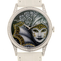 18kt white gold case with a white alligator band. Fixed bezel with diamond set 18kt white gold. Black dial with silver-tone hands. Dial Type: Analog. Patek Philippe Calibre 240 Automatic movement, containing 27 Jewels, composed of 161 parts, bitting at 21600 vph, and has a power reserve of approximately 48 hours. Scratch resistant sapphire crystal. Transparent see through case back. Round case shape, case size: 37 mm. Buckle clasp. Water resistant at 30 meters / 100 feet. Functions: hour, minute. Additional Info: original box, international warranty card, manual (complete accessories). Calatrava Rare Handcrafts Series. Luxury watch style. Watch label: Swiss Made. Patek Philippe Calatrava Rare Handcrafts Automatic Diamond Black Dial Ladies Watch 5077-100G-030. INFORMATION Brand: Patek Philippe Series: Calatrava Rare Handcrafts Collection Name: Calatrava Rare Handcrafts Gender: Womens Model: 5077-100G-030 Watch Label: Swiss Made Movement: Automatic Engine: Patek Philippe Calibre 240 Power Reserve: 48 hours CASE Case Size: 37 mm Case Material: 18kt White Gold Case Shape: Round Case Back: Transparent See Through BAND Band Material: Alligator Band Type: Strap Band Color: White Clasp: Buckle DIAL Dial Color: Black Type: Analog Crystal: Scratch Resistant Sapphire Hands: Silver-tone Bezel: Fixed Bezel Material: Diamond Set 18kt White Gold FEATURES Water Resistance: 30 meters / 100 feet Functions: Hour, Minute Watch Features: Diamond, Gold, Analog, Alligator Leather ADDITIONAL INFO Watch Style: Luxury Warranty: 2 Year Jomashop Warranty Additional Info: Original Box, International Warranty Card, Manual (Complete Accessories) Jomashop Sku: PK-5077100G030 Department: Watches Category: Watches
