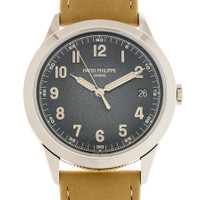White gold case with a beige calfskin band. Fixed bezel. Textured charcoal gray dial with silver-tone hands and Arabic numeral hour markers. Minute scale around the inner rim. Dial Type: Analog. Luminescent hands and markers. Date display at the 3 o'clock position. Patek Philippe Calibre 26-330 S C Automatic movement, containing 30 Jewels, composed of 212 parts, bitting at 28800 vph, and has a power reserve of approximately 45 hours. Scratch resistant sapphire crystal. Transparent see through case back. Round case shape, case size: 40 mm, case thickness: 8.53 mm. Water resistant at 30 meters / 100 feet. Functions: date, hour, minute, second. Calatrava Series. Luxury watch style. Watch label: Swiss Made. Patek Philippe Calatrava Textured Charcoal Gray Dial Automatic Men's Watch 5226G-001. INFORMATION Brand: Patek Philippe Series: Calatrava Collection Name: Calatrava Gender: Mens Model: 5226G-001 Watch Label: Swiss Made Movement: Automatic Engine: Patek Philippe Calibre 26-330 S C CASE Case Size: 40 mm Case Thickness: 8.53 mm Case Material: 18kt White Gold Case Shape: Round Case Back: Transparent See Through BAND Band Material: Calfskin Band Type: Strap Band Color: Beige DIAL Dial Color: Textured Charcoal Gray Type: Analog Crystal: Scratch Resistant Sapphire Hands: Silver-tone Dial Markers: Arabic Numeral Second Markers: Minute Scale around the inner rim Luminiscence: Hands and Markers Bezel: Fixed Bezel Material: 18kt White Gold FEATURES Water Resistance: 30 meters / 100 feet Calendar: Date display at the 3 o'clock position Functions: Date, Hour, Minute, Second Watch Features: Gold, Analog ADDITIONAL INFO Watch Style: Luxury Warranty: 2 Year Jomashop Warranty Jomashop Sku: PK-5226G-001 Department: Watches Category: Watches