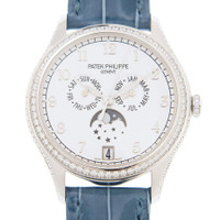 18kt white gold case with a blue (alligator) leather strap. Fixed 18kt white gold bezel set with diamonds. White dial with silver-tone leaf-style hands and Arabic numeral hour markers. Minute markers around the outer rim. Dial Type: Analog. Luminescent hands. Date display at the 6 o'clock position. Three sub-dials displaying: day of the week, month and moonphase. Patek Philippe calibre 324 S QA LU automatic movement, containing 34 Jewels, composed of 328 parts, bitting at 28800 vph, and has a power reserve of approximately 45 hours. Scratch resistant sapphire crystal. 14 diamonds (~0.06 ct) crown. Transparent case back. Round case shape. Case size: 38 mm. Case thickness: 11 mm. Tang clasp. Water resistant at 30 meters / 100 feet. Functions: annual calendar, moon phase, month, date, day, hour, minute, second. Additional Info: original box, manual (complete accessories). Complications Series. Luxury watch style. Watch label: Swiss Made. Patek Philippe Complications Diamond White Dial Ladies Watch 4947G-010. INFORMATION Brand: Patek Philippe Series: Complications Collection Name: Complications Gender: Womens Model: 4947G-010 Watch Label: Swiss Made Movement: Automatic Engine: Patek Philippe Calibre 324 S QA LU Power Reserve: 45 hours CASE Case Size: 38 mm Case Thickness: 11 mm Case Material: 18kt White Gold Case Shape: Round Case Back: Transparent BAND Band Material: (Alligator) Leather Band Type: Strap Band Color: Blue Clasp: Tang DIAL Dial Color: White Type: Analog Crystal: Scratch Resistant Sapphire Hands: Silver-tone Leaf-style Dial Markers: Arabic Numeral Second Markers: Minute Markers around the outer rim Sub Dials: Three - Day of the Week, Month and Moonphase Luminiscence: Hands Bezel: Fixed Bezel Color: 18kt White Gold Bezel Material: 18kt White Gold set with Diamonds Crown: 14 diamonds (~0.06 ct) FEATURES Water Resistance: 30 meters / 100 feet Calendar: Date display at the 6 o'clock position Functions: Annual Calendar, Moon Phase, Month, Date, Day, Hour, Minute, Second Watch Features: Alligator Leather, Analog, Annual Calendar, Month, Gold, Leather, Moon Phase, Diamond ADDITIONAL INFO Watch Style: Luxury Warranty: 2 Year Jomashop Warranty Additional Info: Original Box, Manual (Complete Accessories) Jomashop Sku: PK-4947G010 Department: Watches Category: Watches