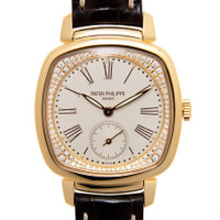 Gold-tone 18kt rose gold case with a brown alligator band. Fixed 18kt rose gold bezel. Silver-tone with 108 diamonds (~0.31 ct.) dial with gold-tone leaf-style shape hands and Roman numeral hour markers. Minute markers around the outer rim. Dial Type: Analog. One - small second subdial. Patek Philippe Calibre 215 PS Hand Wind movement, based upon Patek Philippe 215, containing 18 Jewels, bitting at 28800 vph, and has a power reserve of approximately 44 hours. Scratch resistant sapphire crystal. Transparent case back. Cushion case shape, case size: 30 × 33.8 mm, case thickness: 7.6 mm. Tang clasp. Water resistant at 30 meters / 100 feet. Functions: hour, minute, small second. Additional Info: original box, international warranty card, manual (complete accessories). Luxury watch style. Watch label: Swiss Made. Patek Philippe Gondolo Hand Wind Silver Dial Ladies Watch 7041R-001. INFORMATION Brand: Patek Philippe Series: Gondolo Collection Name: Gondolo Gender: Womens Model: 7041R-001 Watch Label: Swiss Made Movement: Hand Wind Engine: Patek Philippe Calibre 215 PS Power Reserve: 44 hours CASE Case Size: 30 × 33.8 mm Case Thickness: 7.6 mm Case Material: 18kt Rose Gold Case Shape: Cushion Case Back: Transparent BAND Band Material: Alligator Band Type: Strap Band Color: Brown Clasp: Tang DIAL Dial Color: Silver-tone with 108 diamonds (~0.31 ct.) Type: Analog Crystal: Scratch Resistant Sapphire Hands: Gold-tone Leaf-style shape Dial Markers: Roman Numeral Second Markers: Minute Markers around the outer rim Sub Dials: One - Small Second Luminiscence: Hands Bezel: Fixed Bezel Material: 18kt Rose Gold FEATURES Water Resistance: 30 meters / 100 feet Functions: Hour, Minute, Small Second Watch Features: Diamond, Gold, Analog, Alligator Leather ADDITIONAL INFO Watch Style: Luxury Warranty: 2 Year Jomashop Warranty Additional Info: Original Box, Manual (Complete Accessories) Jomashop Sku: PK-7041R001 Department: Watches Category: Watches