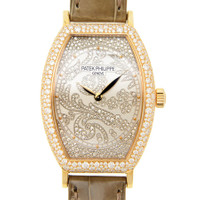 18kt rose gold set with 480 diamonds (3.31 ct.) case with a brown alligator leather strap. Fixed 18kt rose gold diamond set bezel. Gold set with 367 diamond (0.56 ct.) dial with gold-tone leaf-style shape hands and index hour markers. Minute markers around the inner ring. Dial Type: Analog. Patek Philippe Calibre 25-21 REC Hand Wind movement, composed of 142 parts, bitting at 28800 vph, and has a power reserve of approximately 44 hours. Scratch resistant sapphire crystal. Pull / push crown. Transparent case back. Tonneau case shape. Case size: 38.9 mm x 29.6 mm. Water resistant at 30 meters / 100 feet. Functions: hour, minute. Luxury watch style. Watch label: Swiss Made. Item Variations: 7099R 001, 7099R.001, 7099R001. Patek Philippe Gondolo Mechanical Gold and Diamond Dial Ladies Watch 7099R-001. INFORMATION Brand: Patek Philippe Series: Gondolo Collection Name: Gondolo Gender: Womens Model: 7099R-001 Watch Label: Swiss Made Movement: Hand Wind Engine: Patek Philippe Calibre 25-21 REC Power Reserve: 44 hours CASE Case Size: 38.9 mm x 29.6 mm Case Material: 18kt Rose Gold Set with 480 Diamonds (3.31 ct.) Case Shape: Tonneau Case Back: Transparent BAND Band Material: Alligator Leather Band Type: Strap Band Color: Brown DIAL Dial Color: Gold Set with 367 Diamond (0.56 ct.) Type: Analog Crystal: Scratch Resistant Sapphire Hands: Gold-tone Leaf-style shape Dial Markers: Index Second Markers: Minute Markers around the inner ring Bezel: Fixed Bezel Color: 18kt Rose Gold Bezel Material: Diamond Set Crown: Pull / Push FEATURES Water Resistance: 30 meters / 100 feet Functions: Hour, Minute Watch Features: Diamond, Leather, Gold, Analog, Alligator Leather ADDITIONAL INFO Watch Style: Luxury Warranty: 2 Year Jomashop Warranty Jomashop Sku: PK-7099R-001 Item Variation: 7099R 001, 7099R.001, 7099R001 Department: Watches Category: Watches