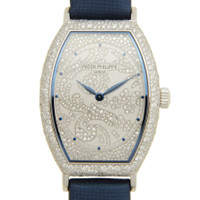 18kt white gold 480 diamonds (~3.31 ct) case with a blue satin strap. Fixed 18kt white gold diamond set bezel. 18kt white gold 367 diamond set (~0.56 ct) dial with blue leaf-style shape hands and index hour markers. Dial Type: Analog. Patek Philippe Calibre 25-21 REC Hand Wind movement, composed of 142 parts, bitting at 28800 vph, and has a power reserve of approximately 44 hours. Scratch resistant sapphire crystal. Transparent case back. Tonneau case shape. Case size: 25 × 21.9 mm. Prong buckle 26 diamonds (~0.15 ct) clasp. Water resistant at 30 meters / 100 feet. Functions: hour, minute. Additional Info: case set with 480 diamonds (3.31 ct), buckle set with 26 diamonds (0.15 cts), dial set with 367 diamonds (0.56 cts). Luxury watch style. Watch label: Swiss Made. Patek Philippe Gondolo Men's Watch 7099G-001. INFORMATION Brand: Patek Philippe Series: Gondolo Collection Name: Gondolo Gender: Mens Model: 7099G-001 Watch Label: Swiss Made Movement: Hand Wind Engine: Patek Philippe Calibre 25-21 REC Power Reserve: 44 hours CASE Case Size: 25 × 21.9 mm Case Material: 18kt White Gold 480 diamonds (~3.31 ct) Case Shape: Tonneau Case Back: Transparent BAND Band Material: Satin Band Type: Strap Band Color: Blue Clasp: Prong buckle 26 diamonds (~0.15 ct) DIAL Dial Color: 18kt White Gold 367 Diamond Set (~0.56 ct) Type: Analog Crystal: Scratch Resistant Sapphire Hands: Blue Leaf-style shape Dial Markers: Index Bezel: Fixed Bezel Color: 18kt White Gold Bezel Material: Diamond Set FEATURES Water Resistance: 30 meters / 100 feet Functions: Hour, Minute Watch Features: Diamond, Gold, Analog ADDITIONAL INFO Watch Style: Luxury Warranty: 2 Year Jomashop Warranty Additional Info: Case set with 480 diamonds (3.31 ct), buckle set with 26 diamonds (0.15 cts), dial set with 367 diamonds (0.56 cts) Jomashop Sku: PK-7099G-001 Department: Watches Category: Watches