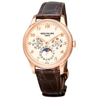 18kt rose gold case with a brown leather strap. Fixed 18kt rose gold bezel. Ivory lacquered dial with rose gold-tone leaf-style shape hands and Arabic numeral hour markers. Minute markers around the outer rim. Dial Type: Analog. Date display at the 6 o'clock position. Three - date (inner moonphase), month, day of the week (inner leap year) subdials. Patek Philippe Calibre 240 Q Automatic movement, containing 27 Jewels, composed of 275 parts, bitting at 21600 vph, and has a power reserve of approximately 48 hours. Scratch resistant sapphire crystal. Skeleton transparent exhibition see through case back. Round case shape. Case size: 39 mm. Slip through buckle clasp. Water resistant at 30 meters / 100 feet. Functions: leap year, month, date, day, hour, minute, second, moonphase, GMT, perpetual calendar, grand complication. Additional Info: unsuitable for prolonged contact with water e.g. swimming, bathing. Luxury watch style. Watch label: Swiss Made. Patek Philippe Grand Complication Automatic Ivory Lacquered Dial Men's Watch 5327R. GENERAL Box Type: Original Box CASE Case Size: 39 Case Material: 18kt Rose Gold Case Shape: Round Case Back: Skeleton Transparent Exhibition See Through BAND Band Material: Leather Band Type: Strap Band Color: Brown Clasp: Slip Through Buckle DIAL Dial Color: Ivory Lacquered Type: Analog Crystal: Scratch Resistant Sapphire Hands: Rose Gold-tone Leaf-style shape Dial Markers: Arabic Numeral Second Markers: Minute Markers around the outer rim Sub Dials: Three - Date (inner Moonphase), Month, Day of the Week (inner leap year) Bezel: Fixed Bezel Material: 18kt Rose Gold INFORMATION Brand: Patek Philippe Series: Grand Complications Collection Name: Grand Complications Gender: Mens Model: 5327R Watch Label: Swiss Made Movement: Automatic Engine: Patek Philippe Calibre 240 Q Power Reserve: 48 hours FEATURES Water Resistance: 30 meters / 100 feet Calendar: Date display at the 6 o'clock position Functions: Leap Year, Month, Date, Day, Hour, Minute, Second, Moonphase, GMT, Perpetual Calendar, Grand Complication Watch Features: Analog, GMT, Leap Year Indicator, Month, Perpetual, Gold, Leather ADDITIONAL INFO Watch Style: Luxury Warranty: 2 Year Jomashop Warranty Additional Info: unsuitable for prolonged contact with water e.g. swimming, bathing Jomashop Sku: PK-5327R Department: Watches Category: Watches