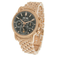 18kt rose gold case with a rose gold-tone 18kt rose gold bracelet. Fixed 18kt rose gold bezel. Black dial with rose gold-tone hands and index hour markers. Minute markers around the outer rim. Dial Type: Analog. Luminescent hands and markers. Perpetual calendar. Chronograph - three sub-dials displaying: 60 second, 60 minute and date/moonphase. Patek Philippe Calibre CHR 29-535 PS Q Hand Wind movement, based upon Patek Philippe CH 29-535 PS Q, containing 34 Jewels, composed of 496 parts, bitting at 28800 vph, and has a power reserve of approximately 65 hours. Scratch resistant sapphire crystal. Transparent case back. Round case shape, case size: 40 mm, case thickness: 14.3 mm. Water resistant at 30 meters / 100 feet. Functions: chronograph, hour, minute, second, split seconds, perpetual calendar. Luxury watch style. Watch label: Swiss Made. Patek Philippe Grand Complications Black Dial Men's Watch 5204/1R-001. INFORMATION Brand: Patek Philippe Series: Grand Complications Collection Name: Grand Complications Gender: Mens Model: 5204/1R-001 Watch Label: Swiss Made Movement: Hand Wind Engine: Patek Philippe Calibre CHR 29-535 PS Q Power Reserve: 65 hours CASE Case Size: 40 mm Case Thickness: 14.3 mm Case Material: 18kt Rose Gold Case Shape: Round Case Back: Transparent BAND Band Material: 18kt Rose Gold Band Type: Bracelet Band Color: Rose Gold-tone DIAL Dial Color: Black Type: Analog Crystal: Scratch Resistant Sapphire Hands: Rose Gold-tone Dial Markers: Index Second Markers: Minute Markers around the outer rim Sub Dials: Three - 60 Second, 60 Minute and Date/Moonphase Luminiscence: Hands and Markers Bezel: Fixed Bezel Material: 18kt Rose Gold FEATURES Water Resistance: 30 meters / 100 feet Calendar: Perpetual Calendar Functions: Chronograph, Hour, Minute, Second, Split Seconds, Perpetual Calendar Watch Features: Chronograph, Gold, Perpetual, Analog ADDITIONAL INFO Watch Style: Luxury Warranty: 2 Year Jomashop Warranty Jomashop Sku: PK-52041R001 Department: Watches Category: Watches