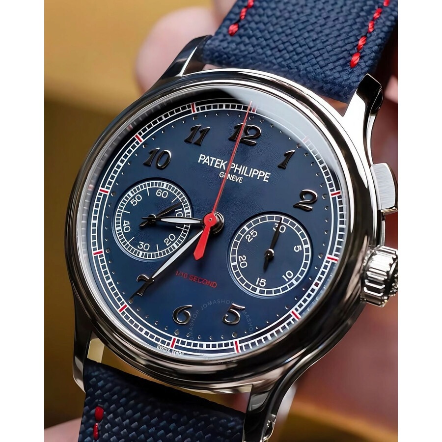 Silver-tone platinum case with a blue leather strap. Fixed silver-tone platinum bezel. Blue dial with silver-tone hands and Arabic numeral hour markers. Minute markers around the outer rim. Dial Type: Analog. Luminescent hands and markers. Chronograph - two sub-dials displaying: 60 second and 30 minute. Patek Philippe Calibre CH 29-535 PS Hand Wind movement, containing 33 Jewels, composed of 269 parts, bitting at 28800 vph, and has a power reserve of approximately 65 hours. Scratch resistant sapphire crystal. Screw down crown. Transparent see through case back. Round case shape, case size: 41 mm. Fold over clasp with a safety release. Water resistant at 30 meters / 100 feet. Functions: chronograph, column wheel, hour, minute, second. Additional Info: original box, international warranty card, manual (complete accessories). Grand Complications Series. Luxury watch style. Watch label: Swiss Made. Patek Philippe Grand Complications Chronograph Hand Wind Blue Dial Men's Watch 5470P-001. CASE Case Size: 41 Case Material: Platinum Case Shape: Round Case Back: Transparent See Through BAND Band Material: Leather Band Type: Strap Band Color: Blue Clasp: Fold Over with Safety Release DIAL Dial Color: Blue Type: Analog Crystal: Scratch Resistant Sapphire Hands: Silver-tone Dial Markers: Arabic Numeral Second Markers: Minute Markers around the outer rim Sub Dials: Two - 60 Second and 30 Minute Luminiscence: Hands and Markers Bezel: Fixed Bezel Color: Silver-tone Bezel Material: Platinum Crown: Screw Down INFORMATION Brand: Patek Philippe Series: Grand Complications Collection Name: Grand Complications Gender: Mens Model: 5470P-001 Watch Label: Swiss Made Movement: Hand Wind Engine: Patek Philippe Calibre CH 29-535 PS Power Reserve: 65 hours FEATURES Water Resistance: 30 meters / 100 feet Functions: Chronograph, Column Wheel, Hour, Minute, Second Watch Features: Analog, Platinum, Leather, Chronograph ADDITIONAL INFO Watch Style: Luxury Warranty: 2 Year Jomashop Warranty Additional Info: Original Box, Manual (Complete Accessories) Jomashop Sku: PK-5470P001 Department: Watches Category: Watches