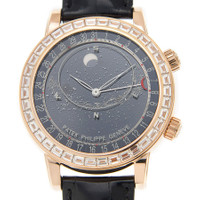 18kt rose gold case with a black alligator leather strap. Fixed 18kt rose gold 38 baguette diamond set bezel. Black dial with silver-tone skeleton leaf-style shape hands and Arabic numeral hour markers. Date scale appears around the outer rim. Dial Type: Analog. Pointer date. Moonphase subdials. Patek Philippe Calibre 240 LU CL C Automatic movement, containing 45 Jewels, composed of 315 parts, bitting at 21600 vph, and has a power reserve of approximately 48 hours. Scratch resistant sapphire crystal. Transparent case back. Round case shape, case size: 44 mm, case thickness: 11.33 mm. Deployment clasp. Functions: hour, minute, pointer date, skychart, phases and orbit of the moon. Additional Info: baguette diamonds on the bezel: 4.27 ct. clasp set with 22 baguette diamonds (1.13 ct). Luxury watch style. Watch label: Swiss Made. Patek Philippe Celestial Grand Complications Automatic Black Dial Men's Watch 6104R-001. GENERAL Box Type: Original Box CASE Case Size: 44 Case Thickness: 11.33 mm Case Material: 18kt Rose Gold Case Shape: Round Case Back: Transparent BAND Band Material: Alligator Leather Band Type: Strap Band Color: Black Clasp: Deployment DIAL Dial Color: Black Type: Analog Crystal: Scratch Resistant Sapphire Hands: Silver-tone Skeleton Leaf-style shape Dial Markers: Arabic Numeral Second Markers: Date scale appears around the outer rim. Sub Dials: One - Moonphase Bezel: Fixed Bezel Color: 18kt Rose Gold Bezel Material: 38 Baguette Diamond Set INFORMATION Brand: Patek Philippe Series: Grand Complications Collection Name: Grand Complications Gender: Mens Model: 6104R-001 Watch Label: Swiss Made Movement: Automatic Engine: Patek Philippe Calibre 240 LU CL C Power Reserve: 48 hours FEATURES Calendar: Pointer Date Functions: Hour, Minute, Pointer Date, Skychart, Phases and orbit of the Moon Watch Features: Alligator Leather, Analog, Gold, Leather, Diamond ADDITIONAL INFO Watch Style: Luxury Warranty: 2 Year Jomashop Warranty Additional Info: Baguette Diamonds on the bezel: 4.27 ct. Clasp set with 22 baguette diamonds (1.13 ct) Jomashop Sku: PK-6104R001 Department: Watches Category: Watches