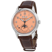 18kt white gold case with a shiny chocolate brown alligator leather strap. Fixed bezel. Rose-gilt opaline dial with charcoal gray hands and Arabic numeral hour markers. Dial Type: Analog. Luminescent hands and markers. Date display between 4 and 5 o'clock position. One subdial displaying: one- date (inner moon phases). Patek Philippe Calibre 324 S Q Automatic movement, containing 29 Jewels, composed of 367 parts, bitting at 28800 vph, and has a power reserve of approximately 45 hours. Scratch resistant sapphire crystal. Transparent see through case back. Round case shape, case size: 40 mm, case thickness: 11.13 mm. Water resistant at 30 meters / 100 feet. Functions: date, hour, minute, second, perpetual calendar, day/night indication. Grand Complications Series. Luxury watch style. Watch label: Swiss Made. Patek Philippe Grand Complications Perpetual Automatic Men's Watch 5320G-011. INFORMATION Brand: Patek Philippe Series: Grand Complications Collection Name: Grand Complications Gender: Mens Model: 5320G-011 Watch Label: Swiss Made Movement: Automatic Engine: Patek Philippe Calibre 324 S Q CASE Case Size: 40 mm Case Thickness: 11.13 mm Case Material: 18kt White Gold Case Shape: Round Case Back: Transparent See Through BAND Band Material: Alligator Leather Band Type: Strap Band Color: Shiny Chocolate Brown Clasp: Fold Over with Safety Release DIAL Dial Color: Rose-gilt Opaline Type: Analog Crystal: Scratch Resistant Sapphire Hands: Charcoal Gray Dial Markers: Arabic Numeral Second Markers: Minute Markers around the outer rim Sub Dials: One- Date (inner moon phases) Luminiscence: Hands and Markers Bezel: Fixed Bezel Material: 18kt White Gold FEATURES Water Resistance: 30 meters / 100 feet Calendar: Date display between 4 and 5 o'clock position Functions: Date, Hour, Minute, Second, Perpetual Calendar, Day/Night Indication Watch Features: Alligator Leather, Analog, Day/Night Indicator, Perpetual, Gold, Leather, Moon Phase ADDITIONAL INFO Watch Style: Luxury Warranty: 2 Year Jomashop Warranty Jomashop Sku: PK-5320G Department: Watches Category: Watches