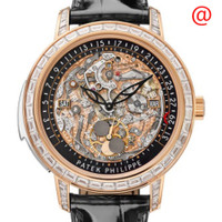 Rose gold-tone 18kt rose gold case with a black alligator band. Fixed rose gold-tone bezel with diamond set 18kt rose gold. Transparent dial with black hands and index hour markers. Minute markers around the outer rim. Dial Type: Analog. Perpetual calendar. One subdial displaying: moonphase. Patek Philippe Calibre R 27 PS QR LU Automatic movement, containing 41 Jewels, bitting at 21600 vph, and has a power reserve of approximately 48 hours. Scratch resistant sapphire crystal. Transparent see through case back. Round case shape, case size: 43 mm, case thickness: 13.3 mm. Fold over clasp with a safety release. Functions: perpetual calendar, moon phase, leap year, month, date, day, hour, minute, small second, minute repeater. Additional Info: 58 baguette diamonds: ~5.25 cts. (bezel and lugs). 22 baguette diamonds: ~0.97 ct. (clasp). total of 80 baguette diamonds: ~6.22 cts. Grand Complications Series. Luxury watch style. Watch label: Swiss Made. Patek Philippe Grand Complications Perpetua CASE Case Size: 43 Case Thickness: 13.3 mm Case Material: 18kt Rose Gold Case Shape: Round Case Back: Transparent See Through BAND Band Material: Alligator Band Type: Strap Band Color: Black Clasp: Fold Over with Safety Release DIAL Dial Color: Transparent Type: Analog Crystal: Scratch Resistant Sapphire Hands: Black Dial Markers: Index Second Markers: Minute Markers around the outer rim Sub Dials: One - Moonphase Bezel: Fixed Bezel Color: Rose Gold-tone Bezel Material: Diamond Set 18kt Rose Gold INFORMATION Brand: Patek Philippe Series: Grand Complications Collection Name: Grand Complications Gender: Mens Model: 5304-301R-001 Watch Label: Swiss Made Movement: Automatic Engine: Patek Philippe Calibre R 27 PS QR LU Power Reserve: 48 hours FEATURES Calendar: Perpetual Calendar Functions: Perpetual Calendar, Moon Phase, Leap Year, Month, Date, Day, Hour, Minute, Small Second, Minute Repeater Watch Features: Alligator Leather, Analog, Leap Year Indicator, Month, Repeater, Perpetual, Gold, Moon Phase, Diamond ADDITIONAL INFO Watch Style: Luxury Warranty: 2 Year Jomashop Warranty Additional Info: 58 baguette diamonds: ~5.25 cts. (bezel and lugs). 22 baguette diamonds: ~0.97 ct. (clasp). Total of 80 baguette diamonds: ~6.22 cts. Jomashop Sku: PK-5304301R001 Department: Watches Category: Watches