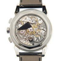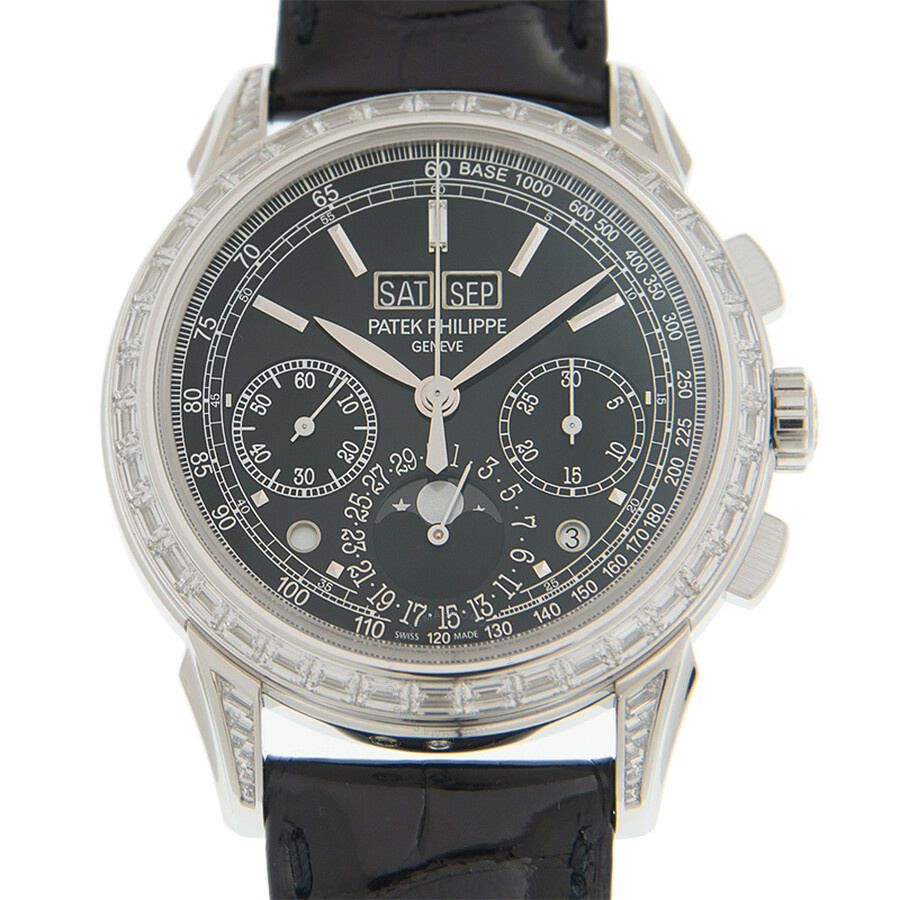 Platinum case with a black leather strap. Fixed set with baguette diamonds bezel. Black lacquered dial with silver-tone hands and Arabic numeral hour markers. Tachymeter. Dial Type: Analog. Luminescent hands. Date display at the 6 o'clock position, day of the week and month display at the 12 o' clock position. Chronograph - three sub-dials displaying: 60 seconds, 30 minute, and moonphase. Patek Philippe Calibre CH 29-535 PS Q Hand Wind movement, containing 34 Jewels, composed of 496 parts, bitting at 28800 vph, and has a power reserve of approximately 65 hours. Scratch resistant sapphire crystal. Case size: 41 mm. Round case shape. Fold over with safety release clasp. Water resistant at 30 meters / 100 feet. Functions: perpetual calendar, moon phase, chronograph, column wheel, leap year, month, date, day, hour, minute, small second, day/night indicator. Additional Info: clasp set with 22 baguette diamonds (~0.97 ct), bezel and lugs set with 58 baguette diamonds (~3.63 ct.). Luxury watch style. Watch label: Swiss Made. Patek Philippe Grand Complications Black Lacquered Dial Automatic Men's Watch 5271P. GENERAL Box Type: Original Box CASE Case Size: 41 Case Material: Platinum Case Shape: Round BAND Band Material: Leather Band Type: Strap Band Color: Black Clasp: Fold Over with Safety Release DIAL Dial Color: Black Lacquered Type: Analog Crystal: Scratch Resistant Sapphire Hands: Silver-tone Leaf-style shape Dial Markers: Arabic Numeral Second Markers: Tachymeter Sub Dials: Three - 60 Second, 30 Minute and Moonphase Luminiscence: Hands Bezel: Fixed set with Baguette Diamonds INFORMATION Brand: Patek Philippe Series: Grand Complications Collection Name: Grand Complications Gender: Mens Model: 5271P-001 Watch Label: Swiss Made Movement: Hand Wind Engine: Patek Philippe Calibre CH 29-535 PS Q Power Reserve: 55 hours FEATURES Water Resistance: 30 meters / 100 feet Calendar: Date display at the 6 o'clock position, Day of the week and month display at the 12 o' clock Position Functions: Perpetual Calendar, Moon Phase, Chronograph, Column Wheel, Leap Year, Month, Date, Day, Hour, Minute, Small Second, Day/Night Indicator Watch Features: Analog, Day/Night Indicator, Leap Year Indicator, Platinum, Month, Perpetual, Leather, Moon Phase, Chronograph, Diamond ADDITIONAL INFO Watch Style: Luxury Warranty: 2 Year Jomashop Warranty Additional Info: clasp set with 22 baguette diamonds (~0.97 ct), Bezel and lugs set with 58 baguette diamonds (~3.63 ct.) Jomashop Sku: PK-5271P Department: Watches Category: Watches